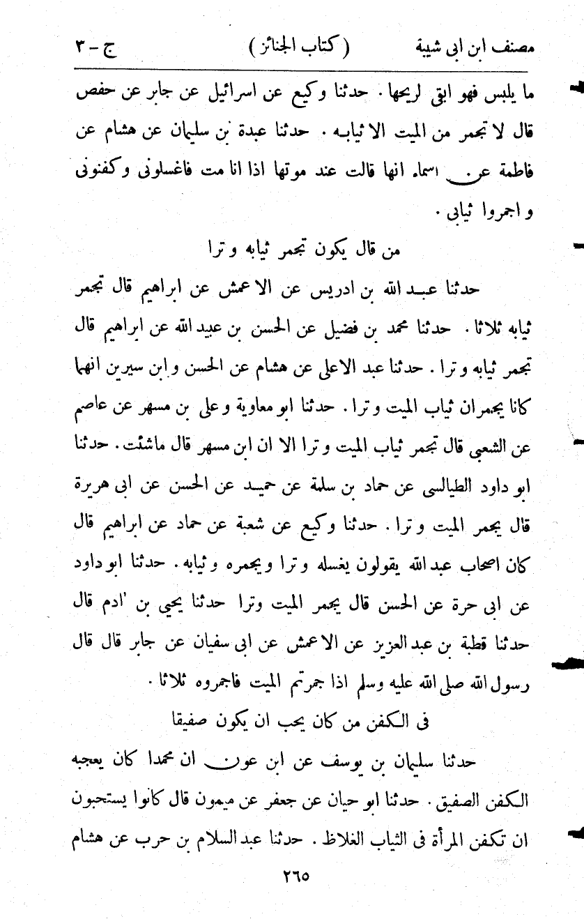 11226- حَدَّثَنَا مُحَمَّدُ بْنُ فُضَيْلٍ ، عَنِ الْحَسَنِ بْنِ عُبَيْدِ اللهِ ، عَنْ إبْرَاهِيمَ ، قَالَ تُجَمَّرُ ثِيَابُهُ وِتْرًا.