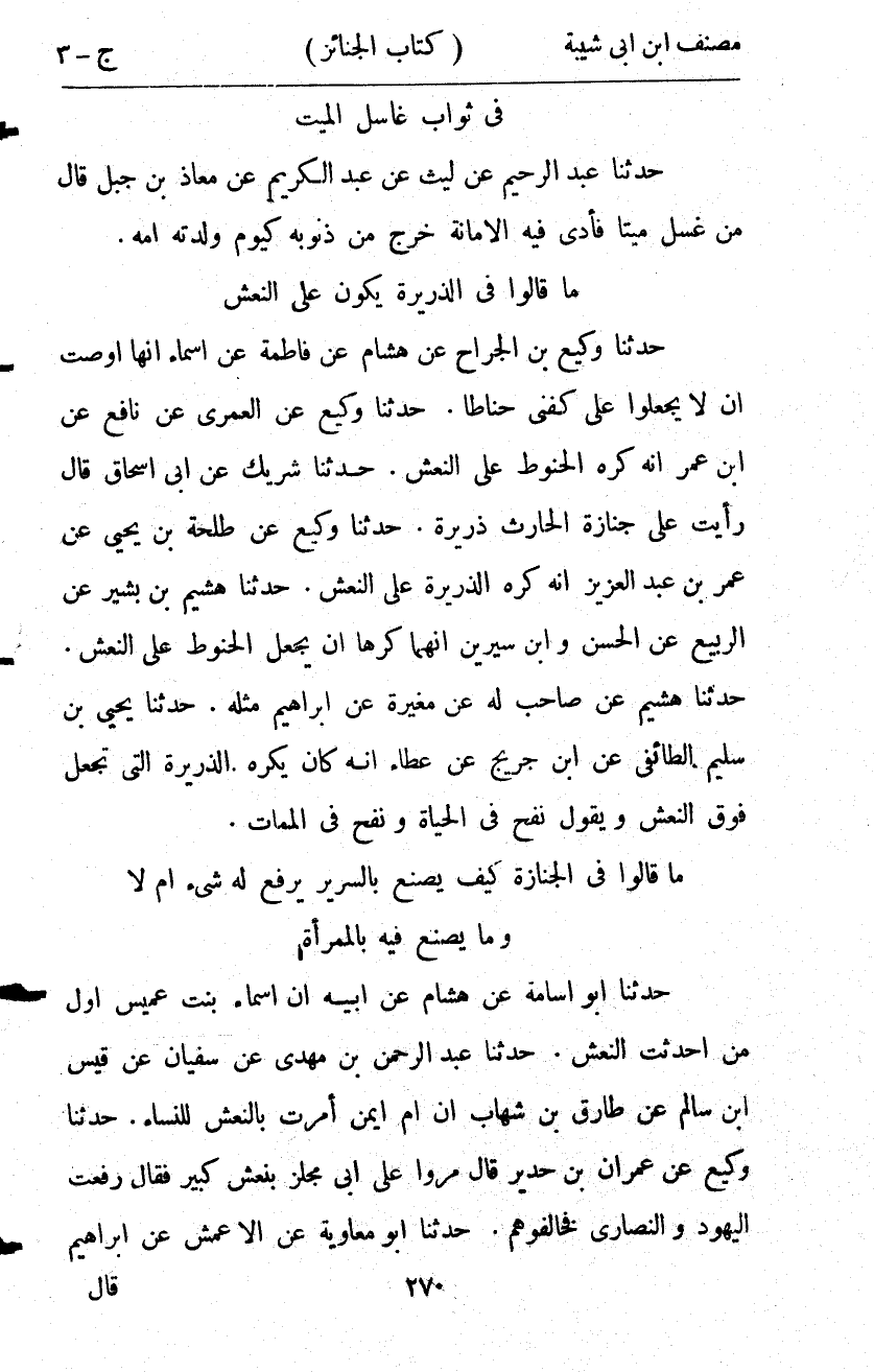 11270- حَدَّثَنَا وَكِيعٌ ، عَنِ الْعُمَرِيِّ ، عَنْ نَافِعٍ ، عَنِ ابْنِ عُمَرَ ، أَنَّهُ كَرِهَ الْحَنُوطَ عَلَى النَّعْشِ.