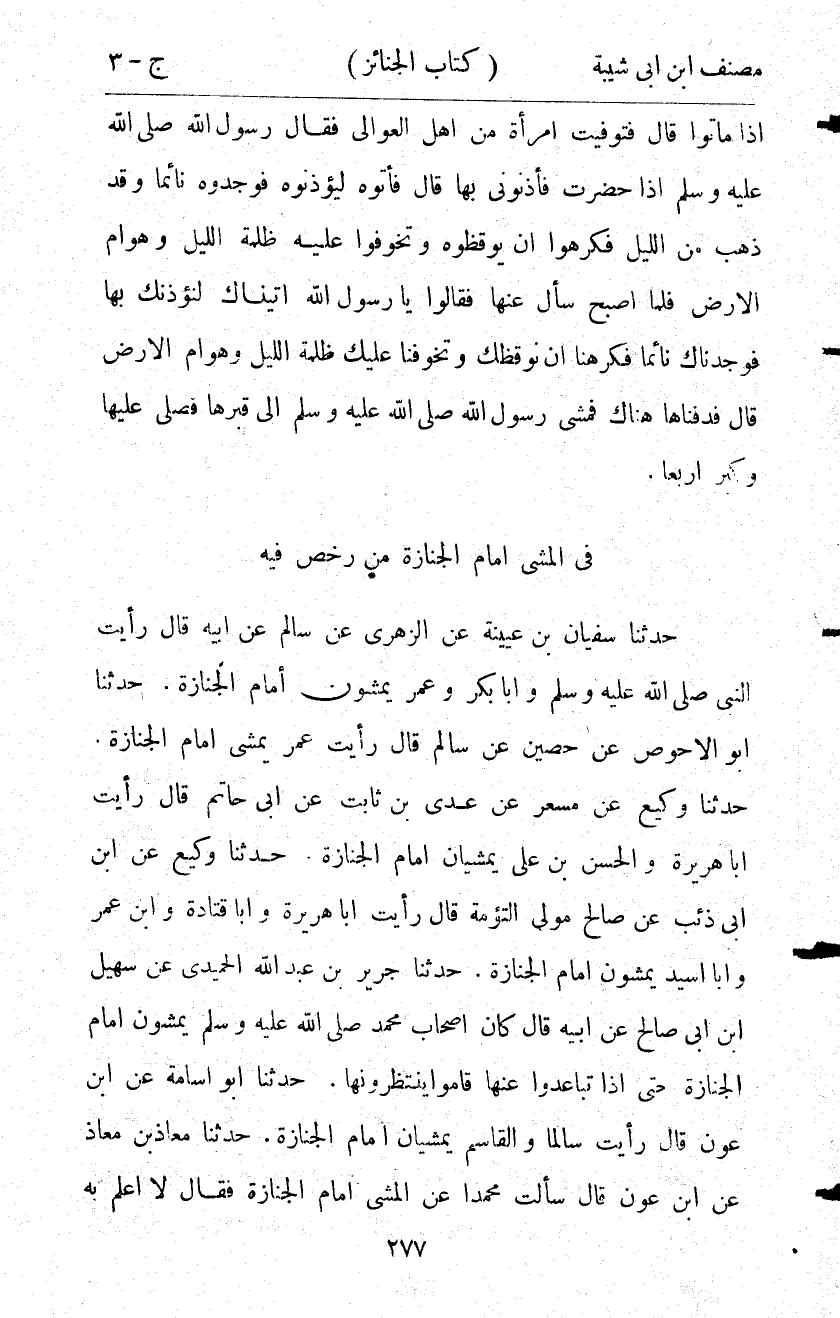 11337- حَدَّثَنَا أَبُو الأَحْوَصِِ ، عَنْ حُصَيْنٍ ، عَنْ سَالِمٍ ، قَالَ : رَأَيْتُ ابن عُمَرَ يَمْشِي أَمَامَ الْجِنَازَةِ.