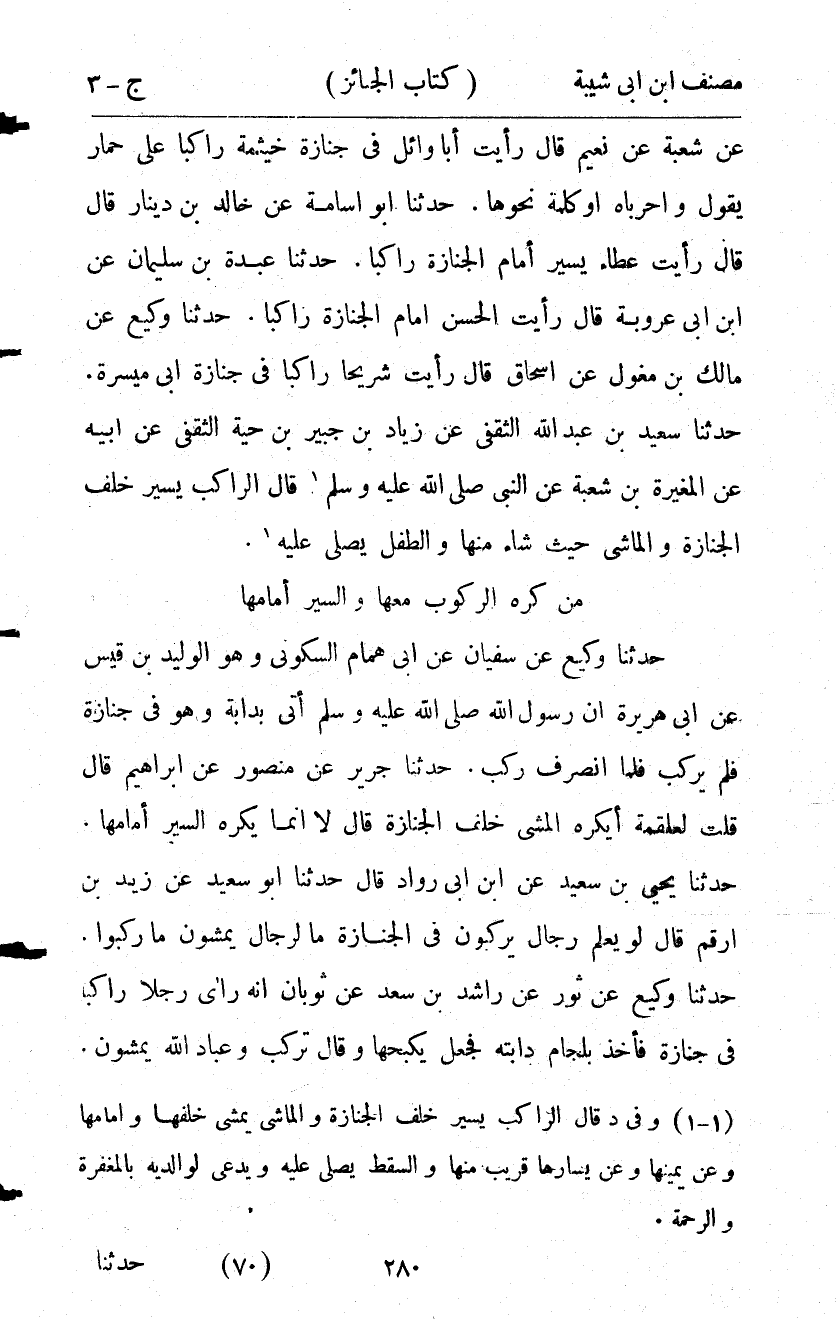 11368- حَدَّثَنَا وَكِيعٌ ، عَنْ سَعِيدُ بْنُ عُبَيْدِ اللهِ الثَّقَفِيُّ ، عَنْ زِيَادِ بْنِ جُبَيْرِ بْنِ حَيَّةَ الثَّقَفِيِّ ، عَنْ أَبِيهِ ، عَنِ الْمُغِيرَةِ بْنِ شُعْبَةَ ، عَنِ النَّبِيِّ صلى الله عليه وسلم ، قَالَ : الرَّاكِبُ خَلْفَ الْجِنَازَةِ , وَالْمَاشِي حَيْثُ شَاءَ مِنْهَا وَالطِّفْلُ يُصَلَّى عَلَيْهِ.