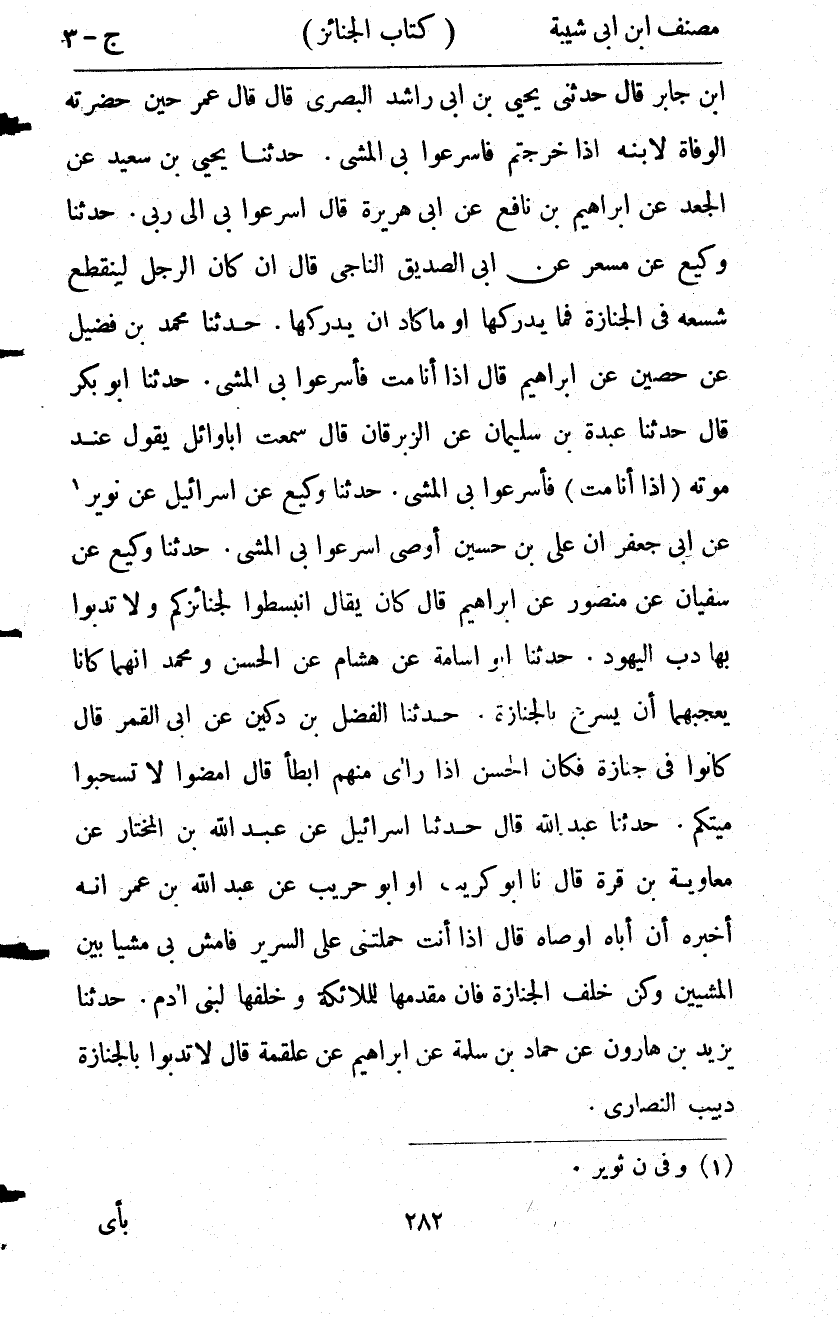 11386- حَدَّثَنَا وَكِيعٌ ، عَنْ إسْرَائِيلَ ، عَنْ ثُوَيْرٍ ، عَنْ أَبِي جَعْفَرٍ ، أَنَّ عَلِيَّ بْنَ حُسَيْنٍ أَوْصَى أَسْرِعُوا بِي الْمَشْيَ.