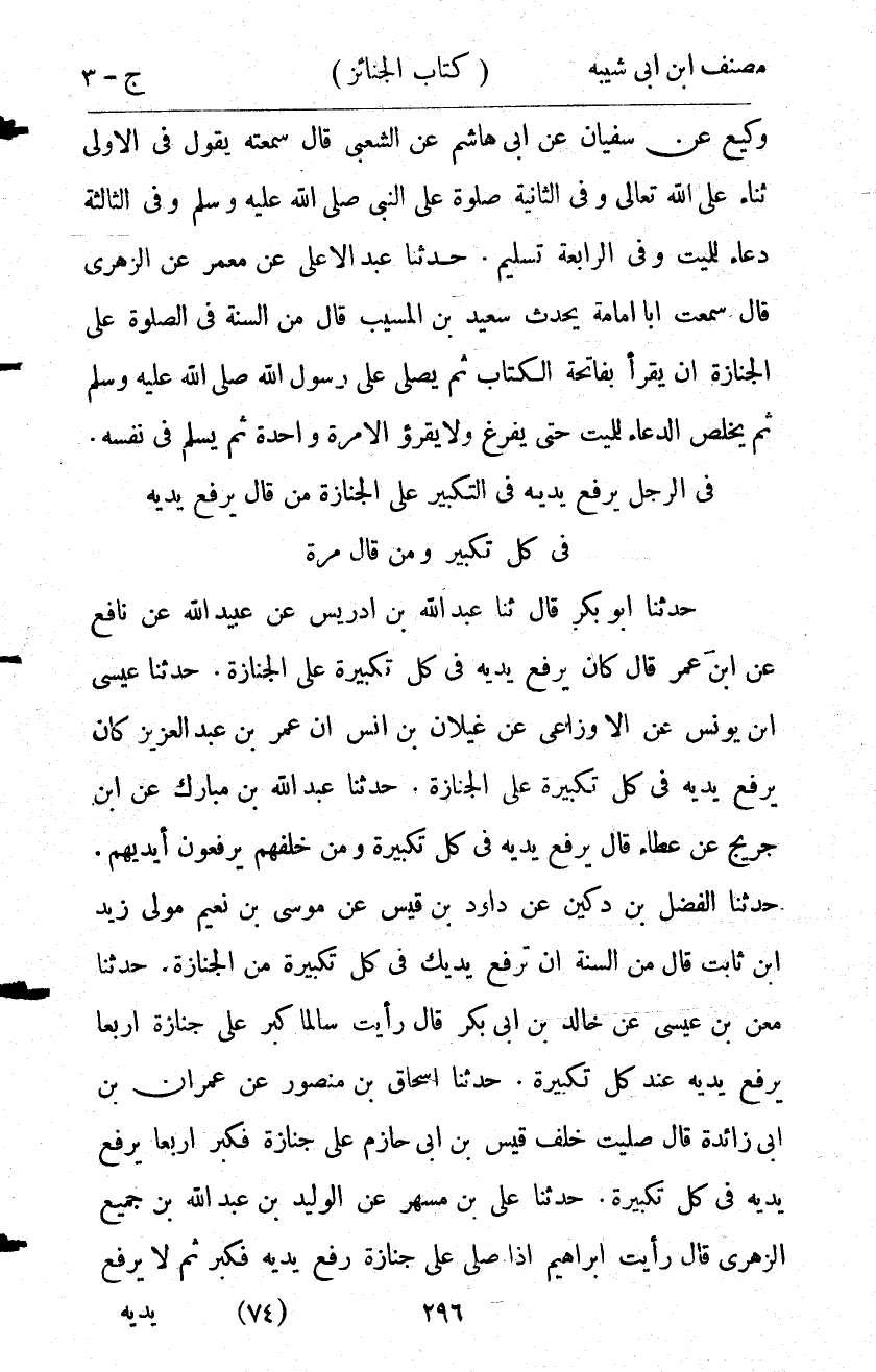 11498- حَدَّثَنَا عَبْدُ اللهِ بْنُ إدْرِيسَ ، عَنْ عُبَيْدِ اللهِ ، عَنْ نَافِعٍ ، عَنِ ابْنِ عُمَرَ ، قَالَ : كَانَ يَرْفَعُ يَدَيْهِ فِي كُلِّ تَكْبِيرَةٍ عَلَى الْجِنَازَةِ.