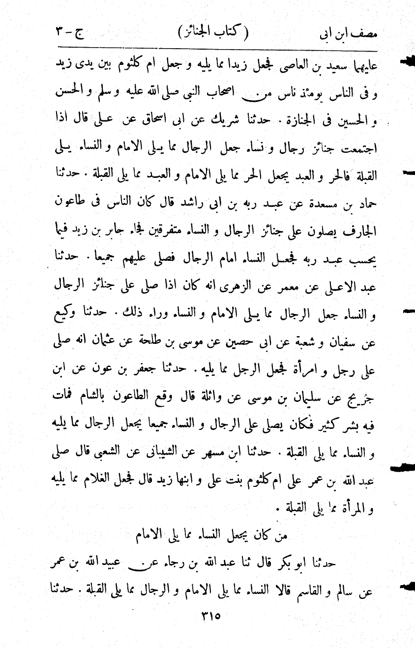 11690- حدَّثَنَا حَمَّادُ بْنُ مَسْعَدَةَ ، عَنْ عَبْدِ رَبِّهِ بْنِ أَبِي رَاشِدٍ ، قَالَ : كَانَ النَّاسُ فِي طَاعُونِ الْجَارِفِ يُصَلُّونَ عَلَى جَنَائِزِ الرِّجَالِ وَالنِّسَاءِ مُتَفَرِّقِينَ , قَالَ : فَجَاءَ جَابِرُ بْنُ زَيْدٍ فِيمَا يَحْسَبُ عَبْدُ رَبِّهِ , فَجَعَلَ النِّسَاءَ أَمَامَ الرِّجَالِ , فَصَلَّى عَلَيْهِمْ جَمِيعًا.