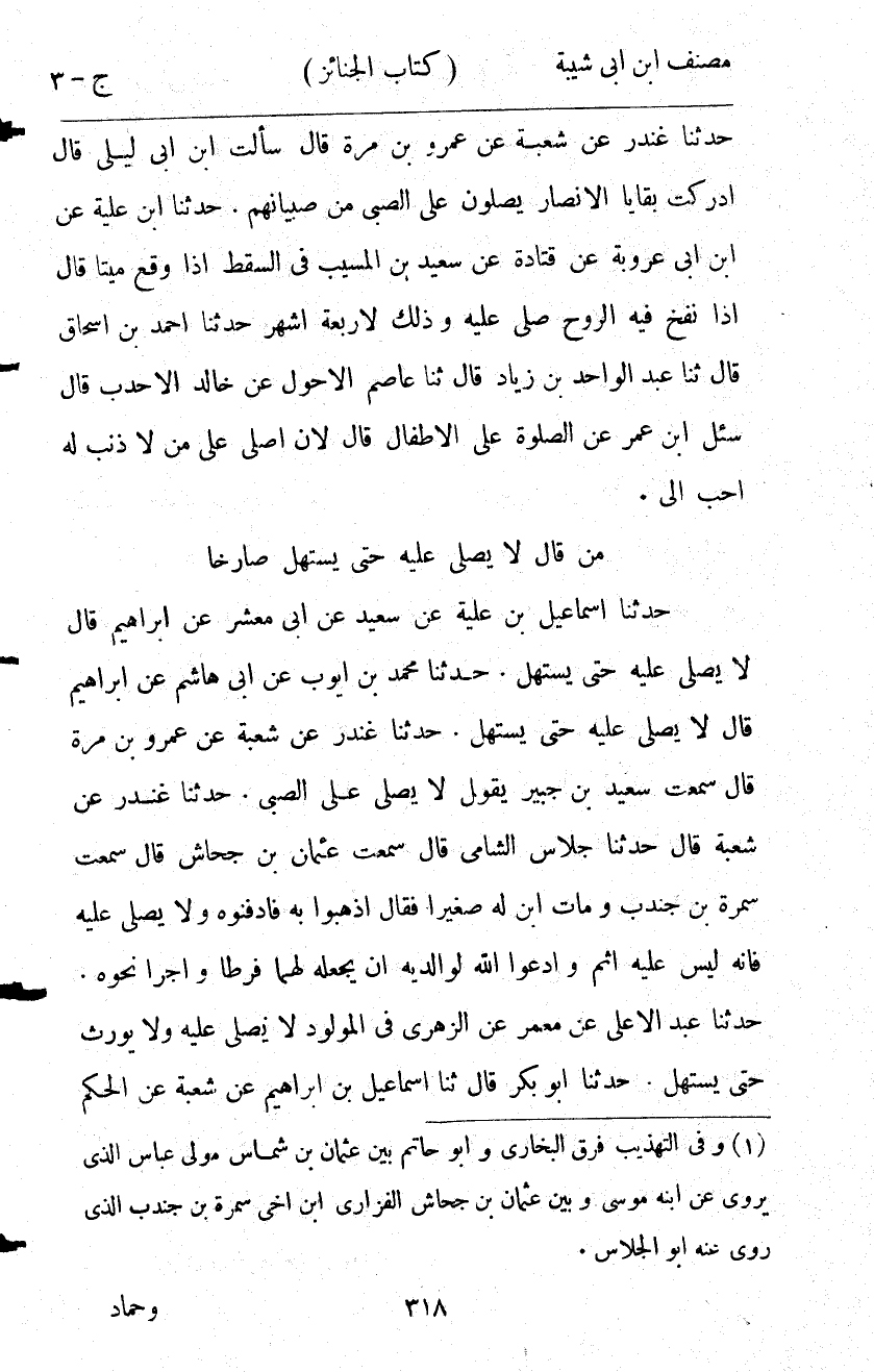 11719- حدَّثَنَا غُنْدَرٌ ، عَنْ شُعْبَةَ ، عَنْ عَمْرِو بْنِ مُرَّةَ ، قَالَ : سَمِعْتُ سَعِيدَ بْنَ جُبَيْرٍ يَقُولُ : لاَ يُصَلَّى عَلَى الصَّبِيِّ.