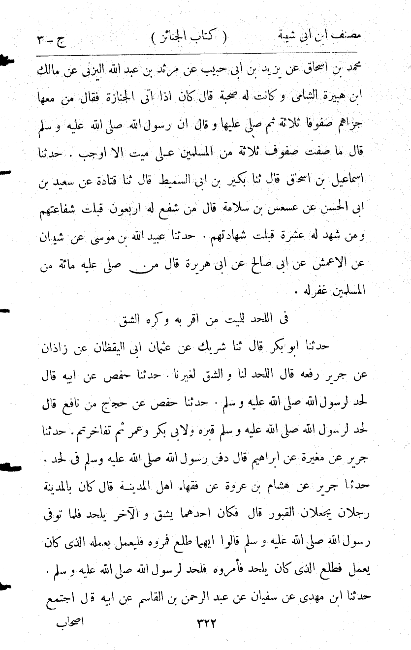 11752- حدَّثَنَا جَرِيرٌ ، عَنْ هِشَامِ بْنِ عُرْوَةَ ، عَنْ فُقَهَاءِ أَهْلِ الْمَدِينَةِ ، قَالَ : كَانَ بِالْمَدِينَةِ رَجُلاَنِ يَحْفُرَانِ الْقُبُورَ ، قَالَ : فَكَانَ أَحَدُهُمَا يَشُقُّ وَالآخَرُ يَلْحَدُ ، فَلَمَّا تُوُفِّيَ رَسُولُ اللهِ صلى الله عليه وسلم قَالُوا : أَيُّهُمَا طَلَعَ فَمُرُوهُ فَلْيَعْمَلْ بِعَمَلِهِ الَّذِي كَانَ يَعْمَلُ فَطَلَعَ الَّذِي كَانَ يَلْحَدُ فَأَمَرُوهُ فَلَحَدَ لِرَسُولِ اللهِ صلى الله عليه وسلم.