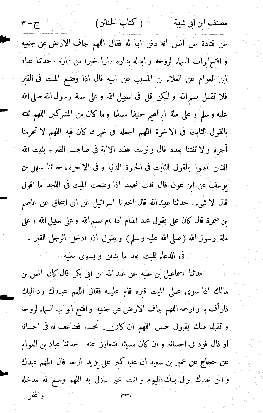 11827- حدَّثَنَا إسْمَاعِيلُ ابْنُ عُلَيَّةَ ، عَنْ عَبْدِ اللهِ بْنِ أَبِي بَكْرٍ ، قَالَ : كَانَ أَنَسُ بْنُ مَالِكٍ إذَا سُوِّيَ عَلَى الْمَيِّتِ قَبْرَهُ قَامَ عَلَيْهِ ، فَقَالَ : اللَّهُمَّ عَبْدُك رُدَّ إلَيْك فَارْأَفْ بِهِ وَارْحَمْهُ , اللَّهُمَّ جَافِ الأَرْضَ عَنْ جَنْبَهِ , وَافْتَحْ أَبْوَابَ السَّمَاءِ لِرُوحِهِ , وَتَقَبَّلْهُ مِنْك بِقَبُولٍ حَسَنٍ , اللَّهُمَّ إِنْ كَانَ مُحْسِنًا فَضَاعِفْ لَهُ فِي إحْسَانِهِ ، أَوَ قَالَ : فَزِدْ فِي إحْسَانِهِ ، وَإِنْ كَانَ مُسِيئًا فَتَجَاوَزْ عَنْهُ.