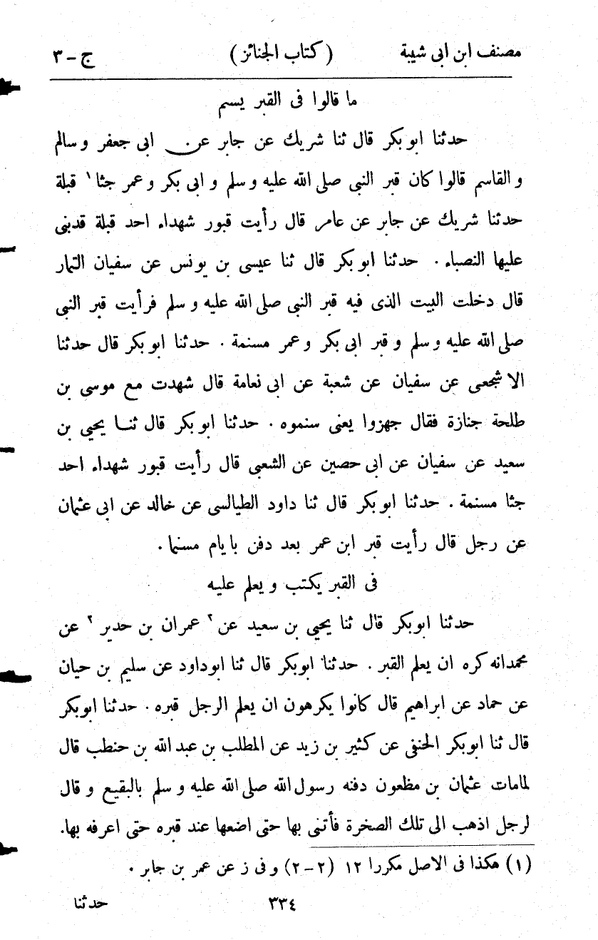 11855- حدَّثَنَا شَرِيكٌ ، عَنْ جَابِرٍ ، عَنْ عَامِرٍ ، قَالَ : رَأَيْتُ قُبُورَ شُهَدَاءِ جُثًا قَدْ نبتت عَلَيْهَا النَّصِي.