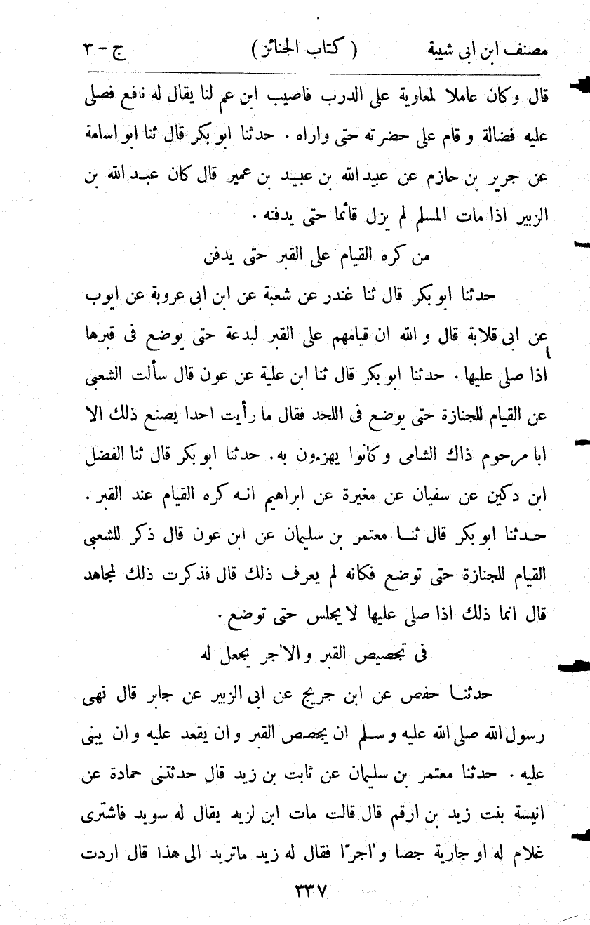 11881- حدَّثَنَا أَبُو أُسَامَةَ ، عَنْ جَرِيرِ بْنِ حَازِمٍ ، عَنْ عُبَيْدِ اللهِ بْنِ عُبَيْدِ بْنِ عُمَيْرِ ، قَالَ : كَانَ عَبْدُ اللهِ بْنُ الزُّبَيْرِ إذَا مَاتَ له الميت لَمْ يَزَلْ قَائِمًا حَتَّى يَدْفِنَهُ.