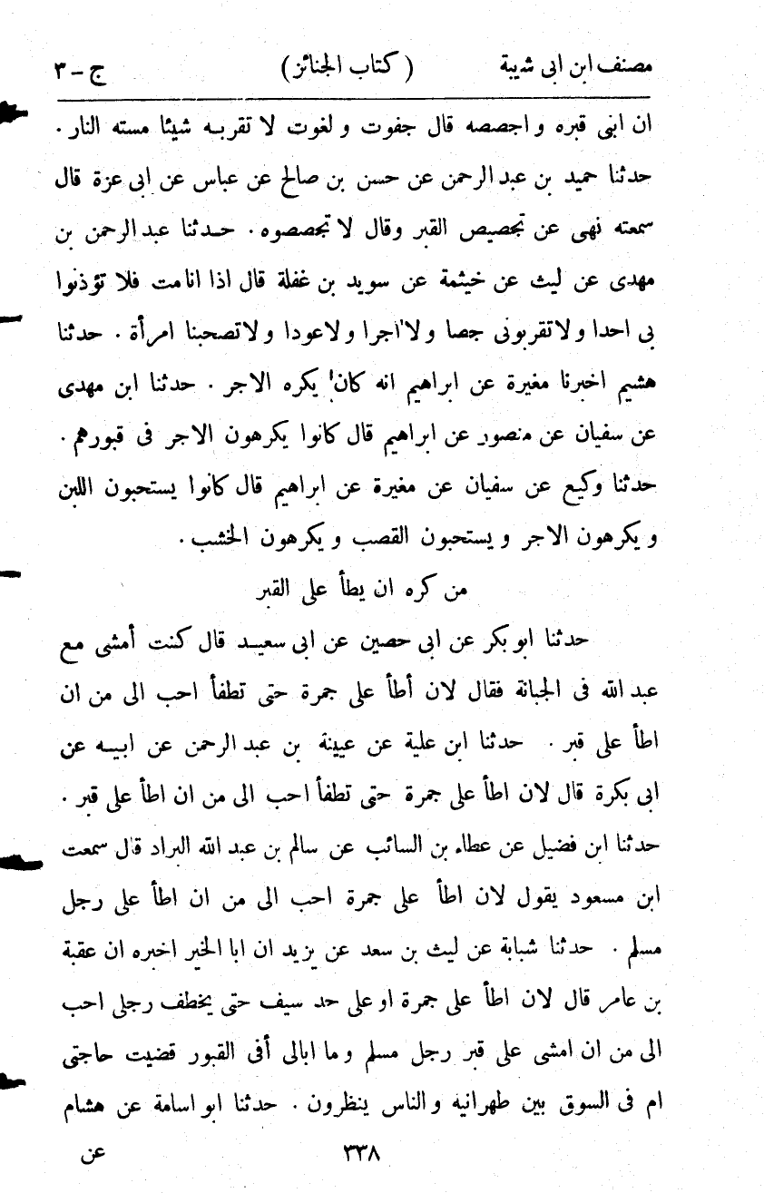 11888- حدَّثَنَا حُمَيْدُ بْنُ عَبْدِ الرَّحْمَنِ ، عَنْ حَسَنِ بْنِ صَالِحٍ ، عَنْ عيسى بنِ أَبِي عَزَّةَ ، قَالَ : سَمِعْتُه ينهَى عَنْ تَجْصِيصِ الْقَبْرِ ، قَالَ : لاَ تُجَصِّصُوهُ.