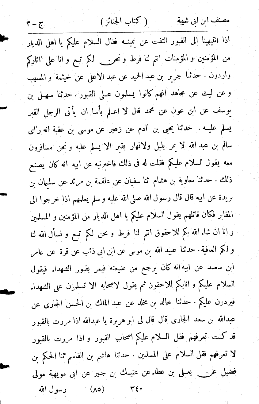 11906- حدَّثَنَا جَرِيرُ بْنُ عَبْدِ الْحَمِيدِ ، عَنْ عَبْدِ الأَعْلَى ، عَنْ خَيْثَمَةَ وَالْمُسَيَّبِ ، وَعَنْ لَيْثٍ ، عَنْ مُجَاهِدٍ أَنَّهُمْ كَانُوا يُسَلِّمُونَ عَلَى الْقُبُورِ.
