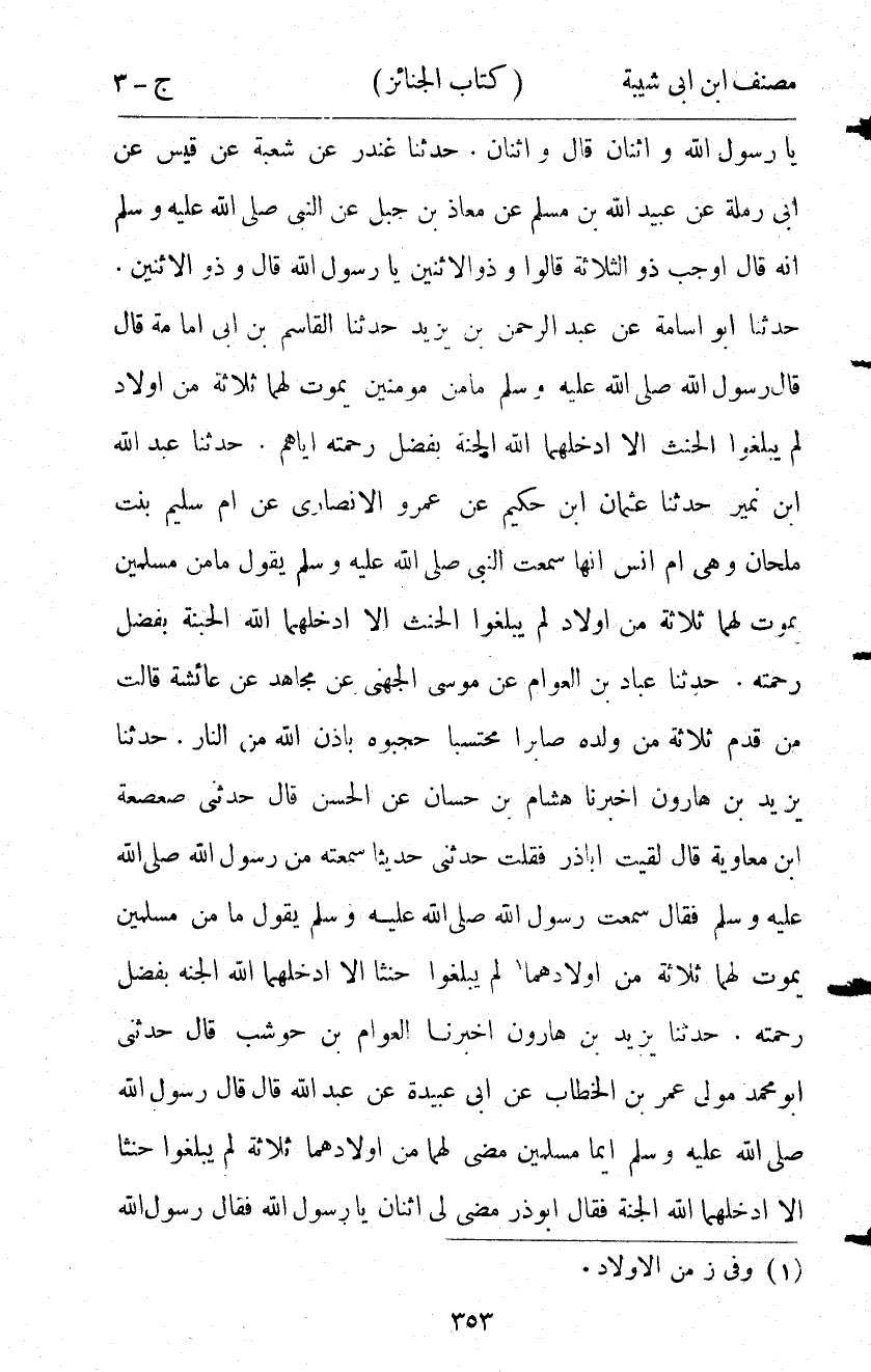 12007- حدَّثَنَا يَزِيدُ بْنُ هَارُونَ ، أَخْبَرَنَا الْعَوَّامُ بْنُ حَوْشَبٍ ، قَالَ : حدَّثَنِي أَبُو مُحَمَّدٍ مَوْلَى عُمَرُ بْنُ الْخَطَّابِ ، عَنْ أَبِي عُبَيْدَةَ ، عَنْ عَبْدِ اللهِ ، قَالَ : قَالَ رَسُولُ اللهِ صلى الله عليه وسلم : أَيُّمَا مُسْلِمَيْنِ مَضَى لَهُمَا مِنْ أَوْلاَدِهِمَا ثَلاَثَةٌ لَمْ يَبْلُغُوا حِنْثًا إِلاَّ أَدْخَلَهُمَا اللَّهُ الْجَنَّةَ ، فَقَالَ أَبُو ذَرٍّ مَضَى لِي اثْنَانِ يَا رَسُولَ اللهِ ، فَقَالَ رَسُولُ اللهِ صلى الله عليه وسلم : وَاثْنَانِ ، فَقَالَ أَبُو الْمُنْذِرِ سَيِّدُ الْقُرَّاءِ مَضَى لِي وَاحِدٌ يَا رَسُولَ اللهِ ، فَقَالَ رَسُولُ اللهِ صلى الله عليه وسلم : ووَاحِدٌ وَذَلِكَ فِي الصَّدْمَةِ الأُولَى.