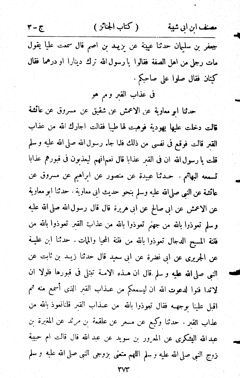 12150- حدَّثَنَا أَبُو مُعَاوِيَةَ ، عَنِ الأَعْمَشِ ، عَنْ شَقِيقٍ ، عَنْ مَسْرُوقٍ : عَنْ عَائِشَةَ , قَالَتْ : دَخَلَتْ عَلَيْهَا يَهُودِيَّةٌ فَوَهَبَتْ لَهَا طِيبًا ، فَقَالَتْ : أَجَارَك اللَّهُ مِنْ عَذَابِ الْقَبْرِ , قَالَتْ : فَوَقَعَ فِي نَفْسِي مِنْ ذَلِكَ ، فَلَمَّا جَاءَ رَسُولُ اللهِ صلى الله عليه وسلم قُلْتُ : يَا رَسُولَ اللهِ إنَّ فِي الْقَبْرِ عَذَابًا ؟ قَالَ : نَعَمْ , إنَّهُمْ لَيُعَذَّبُونَ فِي قُبُورِهِمْ عَذَابًا تَسْمَعُهُ الْبَهَائِمُ.