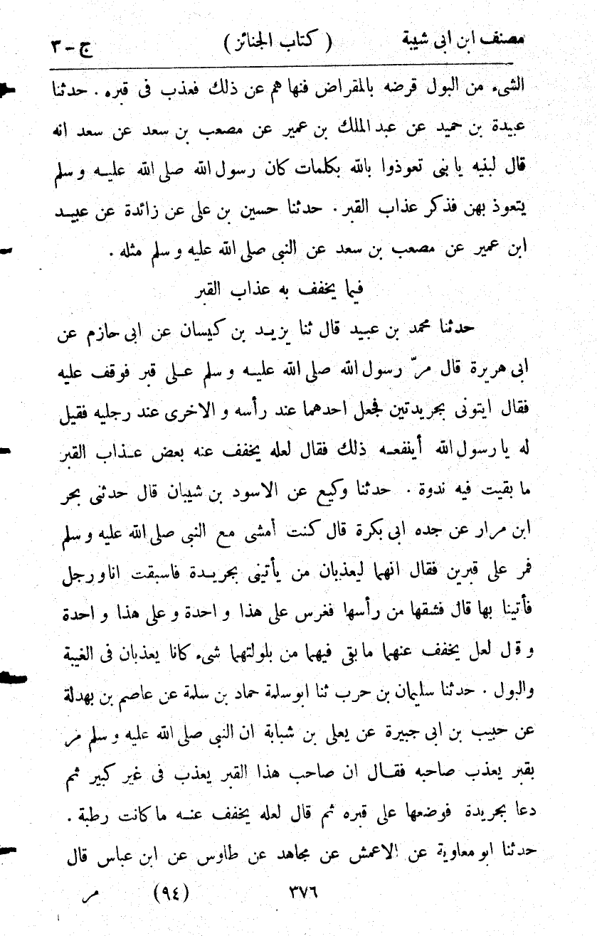 12171- حدَّثَنَا أَبُو مُعَاوِيَةَ ، عَنِ الأَعْمَشِ ، عَنْ مُجَاهِدٍ ، عَنْ طَاوُوسٍ ، عَنِ ابْنِ عَبَّاسٍ ، قَالَ : مَرَّ النَّبِيُّ صلى الله عليه وسلم بِقَبْرَيْنِ ، فَقَالَ : إنَّهُمَا لَيُعَذَّبَانِ وَمَا يُعَذَّبَانِ فِي كَبِيرٍ أَمَّا أَحَدُهُمَا ، فَكَانَ لاَ يَسْتَتِرُ مِنَ الْبَوْلِ , وَأَمَّا الآخَرُ ، فَكَانَ يَمْشِي بِالنَّمِيمَةِ ، ثُمَّ أَخَذَ جَرِيدَةً رَطْبَةً فَشَقَّهَا نِصْفَيْنِ ، ثُمَّ غَرَسَ فِي كُلِّ قَبْرٍ وَاحِدَةً , فَقَالُوا : يَا رَسُولَ اللهِ لِمَ فَعَلْت هَذَا ؟ قَالَ : لَعَلَّهُ أن يُخَفِّفُ عَنْهُمَا مَا لَمْ يَيْبَسَا.