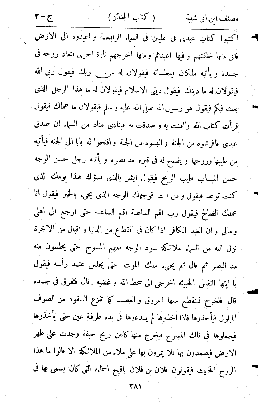 اكْتُبُوا كِتَابَ عَبْدِي فِي عِلِّيِّينَ فِي السَّمَاءِ الرَّابِعَةِ , وَأَعِيدُوهُ إلَى الأَرْضِ , فَإِنِّي مِنْهَا خَلَقْتُهُمْ , وَفِيهَا أُعِيدُهُمْ , وَمِنْهَا أُخْرِجُهُمْ تَارَةً أُخْرَى , فَيُعَادُ رُوحُهُ فِي جَسَدِهِ , وَيَأْتِيهِ مَلَكَانِ فَيُجْلِسَانِهِ فَيَقُولاَنِ لَهُ : مَنْ رَبُّك ؟ فَيَقُولُ : رَبِّي اللَّهُ فَيَقُولاَنِ لَهُ : مَا دِينُك ؟ فَيَقُولُ دِينِي الإِسْلاَمُ , فَيَقُولاَنِ لَهُ : مَا هَذَا الرَّجُلُ الَّذِي بُعِثَ فِيكُمْ ؟ فَيَقُولُ : هُوَ رَسُولُ اللهِ صلى الله عليه وسلم : فَيَقُولاَنِ : مَا عَمَلُك به ؟ فَيَقُولُ : قَرَأْت كِتَابَ اللهِ وَآمَنْت بِهِ وَصَدَقْت بِهِ , فَيُنَادِي مُنَادٍ مِنَ السَّمَاءِ أَنْ صَدَقَ عَبْدِي فَأَفْرِشُوهُ مِنَ الْجَنَّةِ , وَأَلْبِسُوهُ مِنَ الْجَنَّةِ , وَافْتَحُوا لَهُ بَابًا إلَى الْجَنَّةِ , فَيَأْتِيهِ مِنْ طِيبِهَا وَرَوْحِهَا , وَيُفْسَحُ لَهُ فِي قَبْرِهِ مَدَّ بَصَرِهِ , وَيَأْتِيهِ رَجُلٌ حَسَنُ الْوَجْهِ , حَسَنُ الثِّيَابِ , طَيِّبُ الرِّيحِ , فَيَقُولُ : أَبْشِرْ بِاَلَّذِي يَسُرُّك , هَذَا يَوْمُك الَّذِي كُنْت تُوعَدُ , فَيَقُولُ : وَمَنْ أَنْتَ ؟ فَوَجْهُك الْوَجْهُ يَجِيءُ بِالْخَيْرِ , فَيَقُولُ : أَنَا عَمَلُك الصَّالِحُ , فَيَقُولُ : رَبِّ أَقِمَ السَّاعَةَ , رَبِّ أَقِمَ السَّاعَةَ , حَتَّى أَرْجِعَ إلَى أَهْلِي وَمَالِي , وَإِنَّ الْعَبْدَ الْكَافِرَ إذَا كَانَ فِي انْقِطَاعٍ مِنَ الدُّنْيَا , وَإِقْبَالٍ مِنَ الآخِرَةِ , نَزَلَ إلَيْهِ مِنَ السَّمَاءِ مَلاَئِكَةٌ سُودُ الْوُجُوهِ , مَعَهُمَ الْمُسُوحُ , حَتَّى يَجْلِسُونَ مِنْهُ مَدَّ الْبَصَرِ ، قَالَ : ثُمَّ يَجِيءُ مَلَكُ الْمَوْتِ , حَتَّى يَجْلِسَ عِنْدَ رَأْسِهِ , فَيَقُولُ : يَا أَيَّتُهَا النَّفْسُ الْخَبِيثَةُ , اخْرُجِي إلَى سَخَطِ اللهِ وَغَضَبِهِ ، قَالَ : فَتَفْرَّقُ فِي جَسَدِهِ ، قَالَ : فَتَخْرُجُ تُقَطَّعُ مَعَهَا الْعُرُوقُ وَالْعَصَبُ , كَمَا تُنْزَعُ السَّفُّودَ مِنَ الصُّوفِ الْمَبْلُولِ , فَيَأْخُذُوهَا فَإِذَا أَخَذُوهَا لَمْ يَدَعُوهَا فِي يَدِهِ طَرْفَةَ عَيْنٍ حَتَّى يَأْخُذُوهَا فَيَجْعَلُوهَا فِي تِلْكَ الْمُسُوحِ , فَيَخْرُجُ مِنْهَا كَأَنْتَنِ جِيفَةٍ وُجِدَتْ عَلَى ظَهْرِ الأَرْضِ , فَيَصْعَدُونَ بِهَا , فَلاَ يَمُرُّونَ بِهَا عَلَى مَلَكٍ مِنَ الْمَلاَئِكَةِ إِلاَّ قَالُوا : مَا هَذَا الرُّوحُ الْخَبِيثُ ؟ فَيَقُولُونَ : فُلاَنُ بْنُ فُلاَنٍ , بِأَقْبَحِ أَسْمَائِهِ الَّتِي كَانَ يُسَمَّى بِهَا فِي
