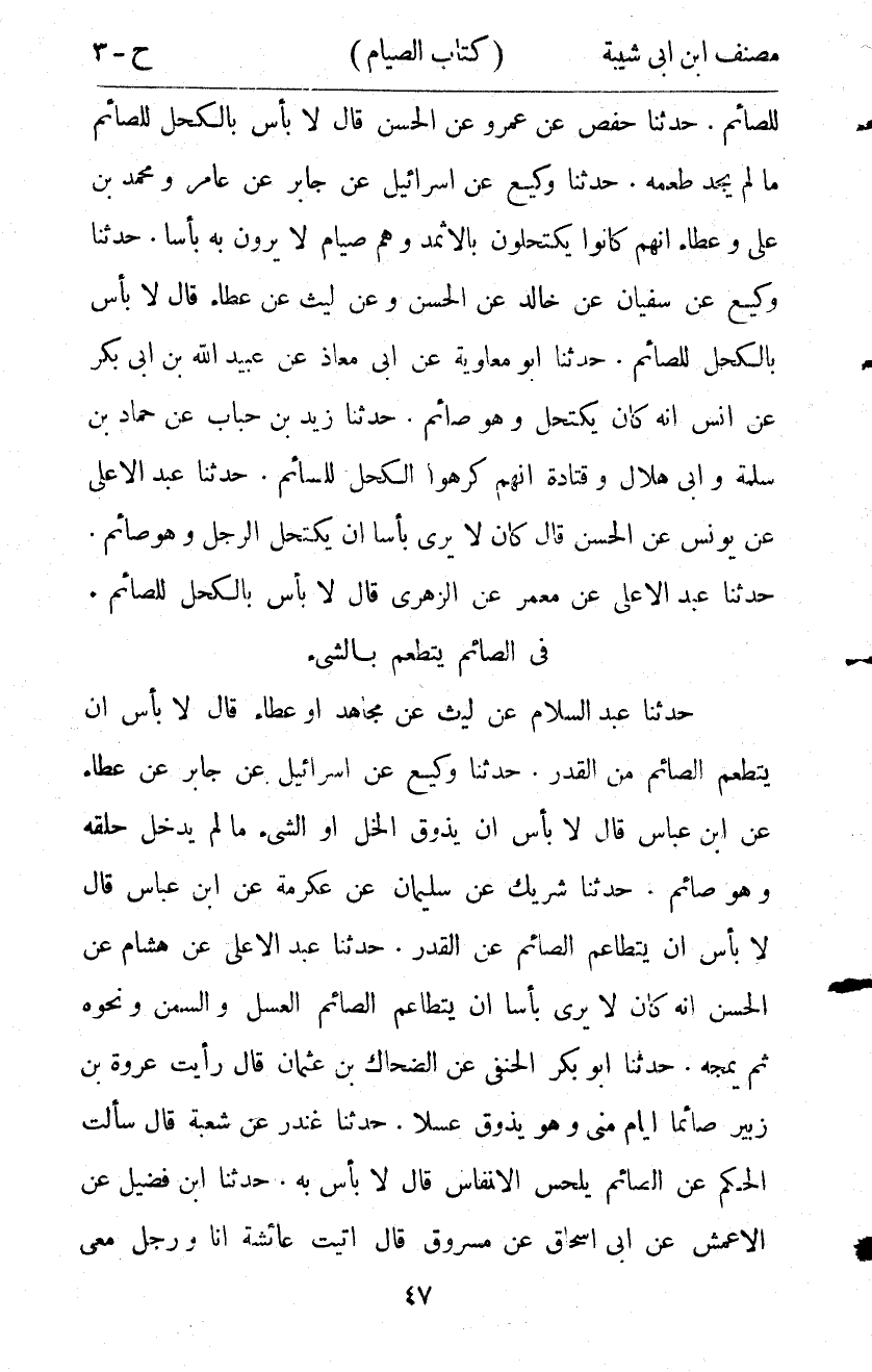 9363- حَدَّثَنَا وَكِيعٌ ، عَنْ سُفْيَانَ ، عَنْ خَالِدٍ ، عَنِ الْحَسَنِ (ح) وَعَنْ لَيْثٍ ، عَنْ عَطَاءٍ ، قَالَ : لاَ بَأْسَ بِالْكُحْلِ لِلصَّائِمِ.