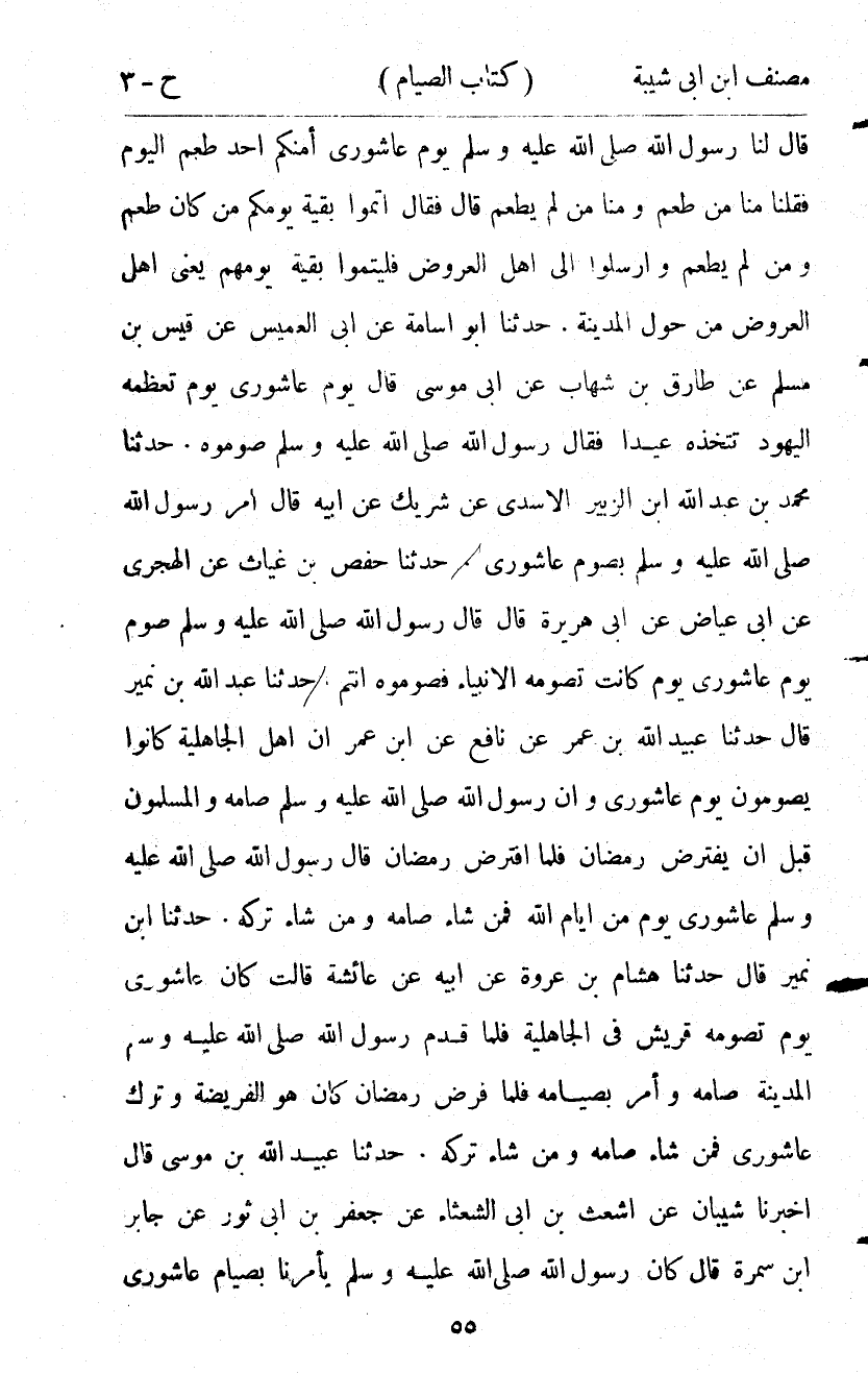 9447- حَدَّثَنَا عَبْدُ اللهِ بْنُ نُمَيْرٍ ، قَالَ : حدَّثَنَا عُبَيْدُ اللهِ بْنُ عُمَرَ ، عَنْ نَافِعٍ ، عَنِ ابْنِ عُمَرَ ؛ أَنَّ أَهْلَ الْجَاهِلِيَّةِ كَانُوا يَصُومُونَ يَوْمَ عَاشُورَاءَ ، وَأَنَّ رَسُولَ اللهِ صلى الله عليه وسلم صَامَهُ وَالْمُسْلِمُونَ قَبْلَ أَنْ يُفْتَرَضَ رَمَضَانُ ، فَلَمَّا اُفْتُرِضَ رَمَضَانُ ، قَالَ رَسُولُ اللهِ صلى الله عليه وسلم : إِنَّ عَاشُورَاءَ يَوْم مِنْ أَيَّامِ اللهِ ، فَمَنْ شَاءَ صَامَهُ ، وَمَنْ شَاءَ تَرَكَهُ.