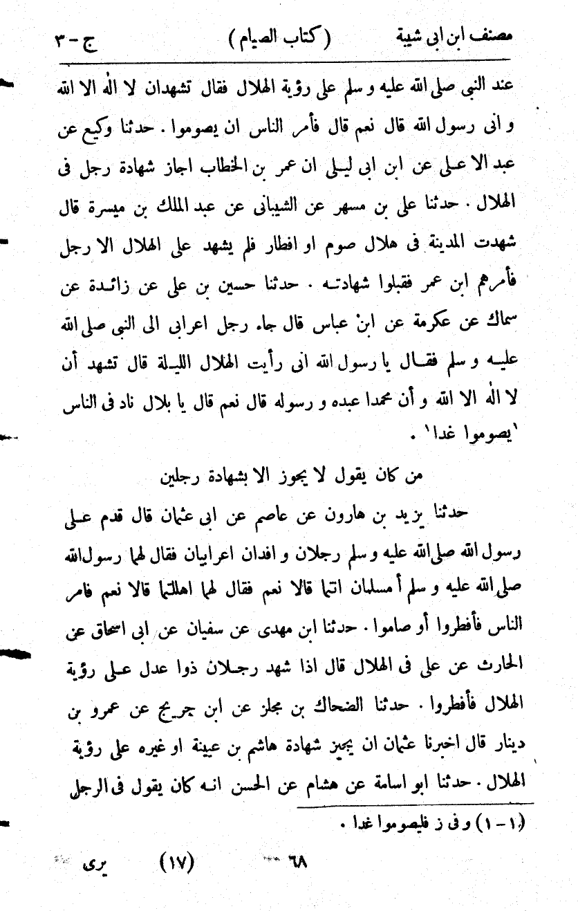 9559- حَدَّثَنَا عَلِيُّ بْنُ مُسْهِرٍ ، عَنِ الشَّيْبَانِيِّ ، عَنْ عَبْدِ الْمَلِكِ بْنِ مَيْسَرَةَ ، قَالَ : شَهِدْتُ الْمَدِينَةَ فِي هِلاَلِ صَوْمٍ ، أَوْ إفْطَارٍ ، فَلَمْ يَشْهَدْ عَلَى الْهِلاَلِ إِلاَّ رَجُلٌ ، فَأَمَرَهُمَ ابْنُ عُمَرَ فَقَبِلُوا شَهَادَتَهُ.