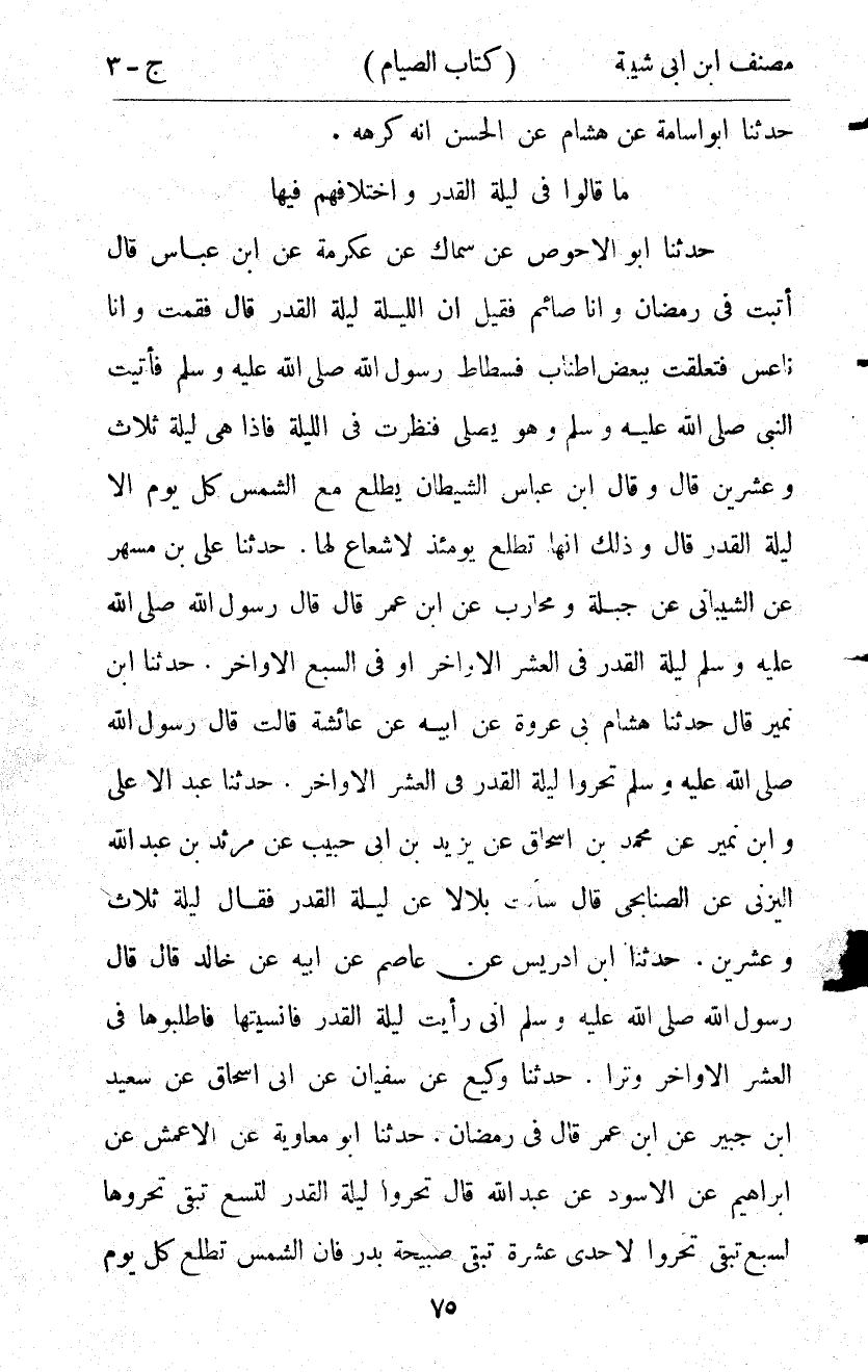 9622- حَدَّثَنَا أَبُو مُعَاوِيَةَ ، عَنِ الأَعْمَشِ ، عَنْ إبْرَاهِيمَ ، عَنِ الأَسْوَد ، عَنْ عَبْدِ اللهِ ، قَالَ : تَحَرَّوْا لَيْلَةَ الْقَدْرِ لِسَبْعٍ تَبْقَى ، تَحَرَّوْهَا لِتِسْعٍ تَبْقَى ، تَحَرَّوها لإِحْدَى عَشْرَةَ تَبْقَى ، صَبِيحَةَ بَدْرٍ ، فَإِنَّ الشَّمْسَ تَطْلُعُ كُلَّ يَوْمٍ بَيْنَ قَرْنَيْ شَيْطَانٍ إِلاَّ صَبِيحَةَ بَدْرٍ.