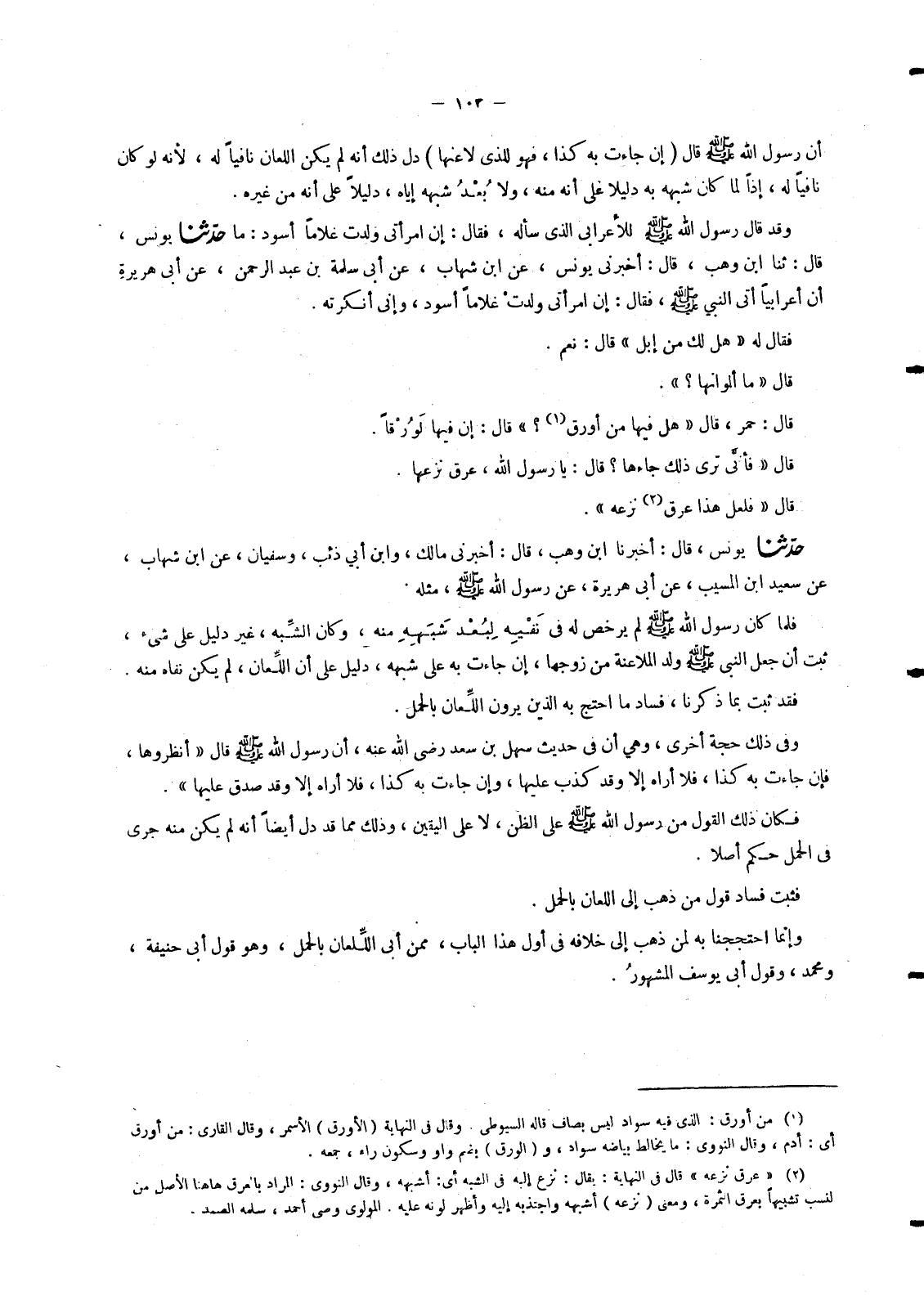 حَدَّثَنَا يُونُسُ , قَالَ: ثنا ابْنُ وَهْبٍ , قَالَ: أَخْبَرَنِي يُونُسُ , عَنِ ابْنِ شِهَابٍ , عَنْ أَبِي سَلَمَةَ بْنِ عَبْدِ الرَّحْمَنِ , عَنْ أَبِي هُرَيْرَةَ " أَنَّ أَعْرَابِيًّا أَتَى النَّبِيَّ صَلَّى اللَّهُ عَلَيْهِ وَسَلَّمَ , فَقَالَ: إِنَّ امْرَأَتِي وَلَدَتْ غُلَامًا أَسْوَدَ , وَإِنَى أَنْكَرْتُهُ. فَقَالَ لَهُ: «§هَلْ لَكَ مِنْ إِبِلٍ» قَالَ: نَعَمْ. قَالَ: «مَا أَلْوَانُهَا؟» . قَالَ: حُمْرٌ , قَالَ: «هَلْ فِيهَا مِنْ أَوْرَقَ؟» قَالَ: إِنَّ فِيهَا لَوُرْقًا. قَالَ: «فَأَنَّى تَرَى ذَلِكَ جَاءَهَا؟» قَالَ: يَا رَسُولَ اللهِ , عِرْقٌ نَزَعَهَا. قَالَ: «فَلَعَلَّ هَذَا عِرْقٌ نَزَعَهُ» .