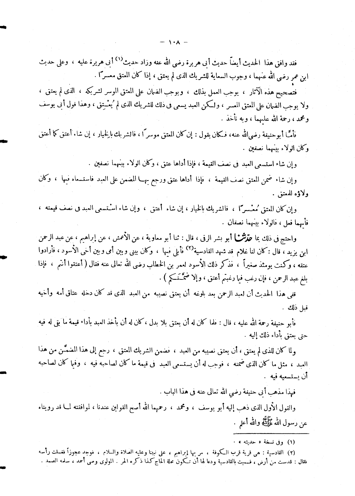 4694 - حَدَّثَنَا أَبُو بِشْرٍ الرَّقِّيُّ , قَالَ: ثنا أَبُو مُعَاوِيَةَ , عَنِ الْأَعْمَشِ , عَنْ إِبْرَاهِيمَ , عَنْ عَبْدِ الرَّحْمَنِ بْنِ يَزِيدَ , قَالَ: §كَانَ لَنَا غُلَامٌ قَدْ شَهِدَ الْقَادِسِيَّةَ فَأَبْلَى فِيهَا , وَكَانَ بَيْنِي وَبَيْنَ أُمِّي وَبَيْنَ أَخِي الْأَسْوَدِ , فَأَرَادُوا عِتْقَهُ , وَكُنْتُ يَوْمَئِذٍ صَغِيرًا , فَذَكَرَ ذَلِكَ الْأَسْوَدُ لِعُمَرَ بْنِ الْخَطَّابِ رَضِيَ اللهُ تَعَالَى عَنْهُ , فَقَالَ: «أَعْتِقُوا أَنْتُمْ , فَإِذَا بَلَغَ عَبْدُ الرَّحْمَنِ , فَإِنْ رَغِبَ فِيمَا رَغِبْتُمْ أَعْتَقَ , وَإِلَّا ضَمِنَكُمْ» . فَفِي هَذَا الْحَدِيثِ أَنَّ لِعَبْدِ الرَّحْمَنِ بَعْدَ بُلُوغِهِ أَنْ يُعْتِقَ نَصِيبَهُ مِنَ الْعَبْدِ الَّذِي قَدْ كَانَ دَخَلَهُ عَتَاقُ أُمِّهِ وَأَخِيهِ قَبْلَ ذَلِكَ. فَأَبُو حَنِيفَةَ رَحْمَةُ اللهِ عَلَيْهِ قَالَ: فَلَمَّا كَانَ لَهُ أَنْ يُعْتِقَ بِلَا بَدَلٍ , كَانَ لَهُ أَنْ يَأْخُذَ الْعَبْدَ بِأَدَاءِ قِيمَةِ مَا بَقِيَ لَهُ فِيهِ حَتَّى يَعْتِقَ بِأَدَاءِ ذَلِكَ إِلَيْهِ , وَلَمَّا كَانَ لِلَّذِي لَمْ يُعْتِقْ , أَنْ يُعْتِقَ نَصِيبَهُ مِنَ الْعَبْدِ , فَضَمِنَ الشَّرِيكُ الْمُعْتِقُ , رَجَعَ إِلَى هَذَا الْمُضَمَّنِ مِنْ هَذَا الْعَبْدِ , مِثْلُ مَا كَانَ الَّذِي ضَمِنَهُ , فَوَجَبَ لَهُ أَنْ يَسْتَسْعِيَ الْعَبْدَ فِي قِيمَةِ مَا كَانَ لِصَاحِبِهِ فِيهِ , وَفِيمَا كَانَ لِصَاحِبِهِ أَنْ يَسْتَسْعِيَهُ فِيهِ. فَهَذَا مَذْهَبُ أَبِي حَنِيفَةَ رَضِيَ اللهُ تَعَالَى عَنْهُ فِي هَذَا الْبَابِ , وَالْقَوْلُ الْأَوَّلُ الَّذِي ذَهَبَ إِلَيْهِ أَبُو يُوسُفَ , وَمُحَمَّدٌ رَحِمَهُمَا اللهُ أَصَحُّ الْقَوْلَيْنِ عِنْدَنَا , لِمُوَافَقَتِهِ لِمَا قَدْ رَوَيْنَاهُ عَنْ رَسُولِ اللهِ صَلَّى اللَّهُ عَلَيْهِ وَسَلَّمَ , وَاللهُ أَعْلَمُ