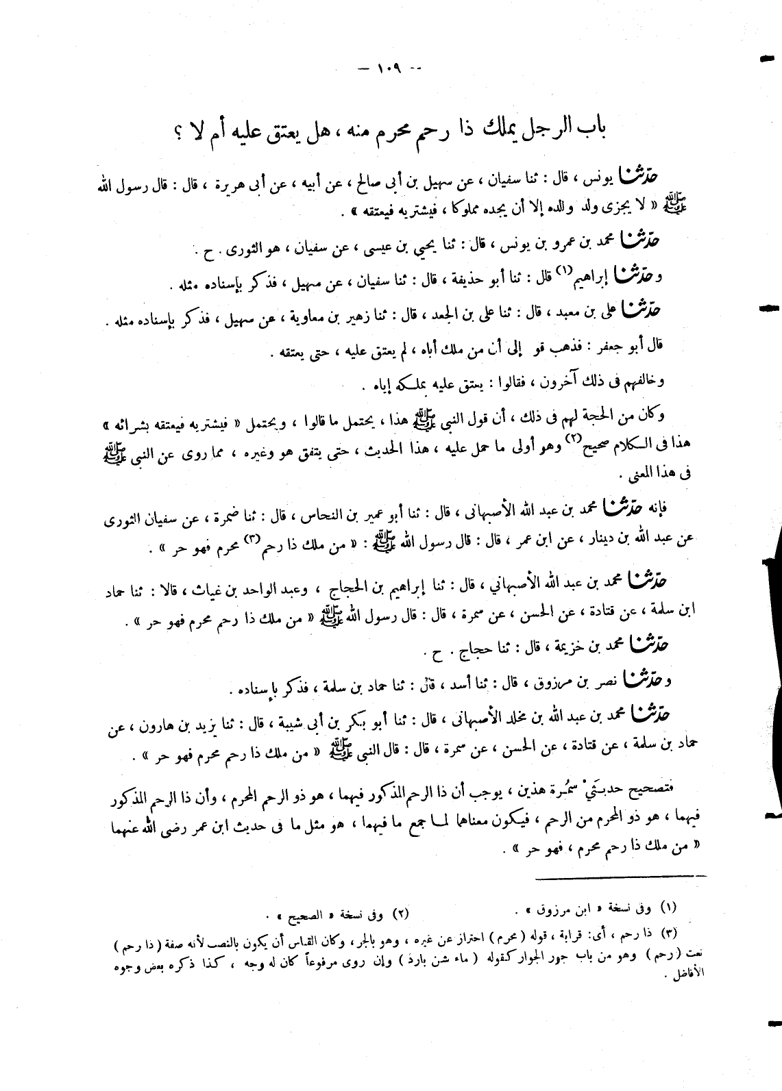 4703 - حَدَّثَنَا مُحَمَّدُ بْنُ عَبْدِ اللهِ بْنِ مَخْلَدٍ الْأَصْبَهَانِيُّ , قَالَ: ثنا أَبُو بَكْرِ بْنُ أَبِي شَيْبَةَ , قَالَ: ثنا يَزِيدُ بْنُ هَارُونَ , عَنْ حَمَّادِ بْنِ سَلَمَةَ , عَنْ قَتَادَةَ , عَنِ الْحَسَنِ , عَنْ سَمُرَةَ , قَالَ: قَالَ النَّبِيُّ صَلَّى اللَّهُ عَلَيْهِ وَسَلَّمَ «§مَنْ مَلَكَ ذَا رَحِمٍ مَحْرَمٍ فَهُوَ حُرٌّ» . فَتَصْحِيحُ حَدِيثَيْ سَمُرَةَ هَذَيْنِ يُوجِبُ أَنَّ ذَا الرَّحِمِ الْمَذْكُورِ فِيهِمَا , هُوَ ذُو الرَّحِمِ الْمَحْرَمِ , وَأَنَّ ذَا الرَّحِمِ الْمَذْكُورِ فِيهِمَا , هُوَ ذُو الْمَحْرَمِ مِنَ الرَّحِمِ , فَيَكُونُ مَعْنَاهُمَا لِمَا جُمِعَ مَا فِيهِمَا , هُوَ مِثْلُ مَا فِي حَدِيثِ ابْنِ عُمَرَ رَضِيَ اللهُ عَنْهُمَا: «مَنْ مَلَكَ ذَا رَحِمٍ مَحْرَمٍ , فَهُوَ حُرٌّ»