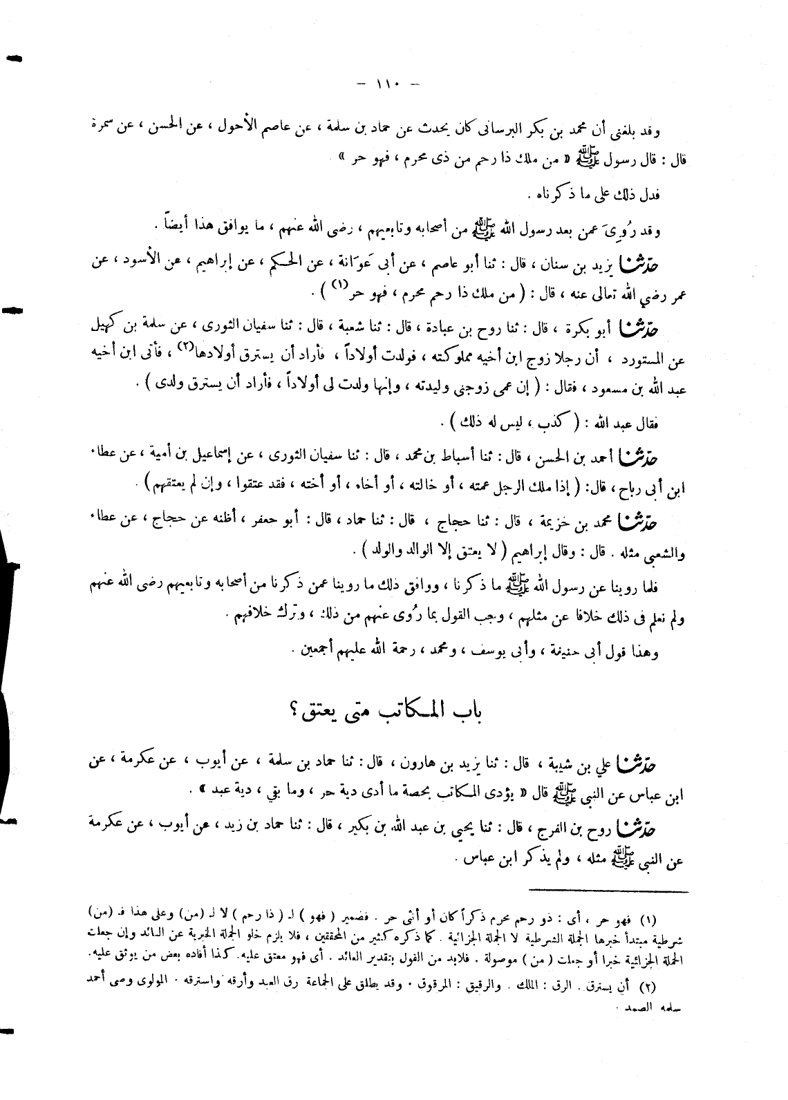 وَقَدْ بَلَغَنِي , أَنَّ مُحَمَّدَ بْنَ بَكْرٍ الْبُرْسَانِيَّ كَانَ يُحَدِّثُ , عَنْ حَمَّادِ بْنِ سَلَمَةَ , عَنْ عَاصِمٍ الْأَحْوَلِ , عَنِ الْحَسَنِ , عَنْ سَمُرَةَ قَالَ: قَالَ رَسُولُ صَلَّى اللَّهُ عَلَيْهِ وَسَلَّمَ: «§مَنْ مَلَكَ ذَا رَحِمٍ مِنْ ذِي مَحْرَمٍ , فَهُوَ حُرٌّ» . فَدَلَّ ذَلِكَ عَلَى مَا ذَكَرْنَاهُ , وَقَدْ رُوِيَ عَمَّنْ بَعْدَ رَسُولِ اللهِ صَلَّى اللَّهُ عَلَيْهِ وَسَلَّمَ مِنْ أَصْحَابِهِ وَتَابِعِيهِمْ رَضِيَ اللهُ عَنْهُمْ , مَا يُوَافِقُ هَذَا أَيْضًا
