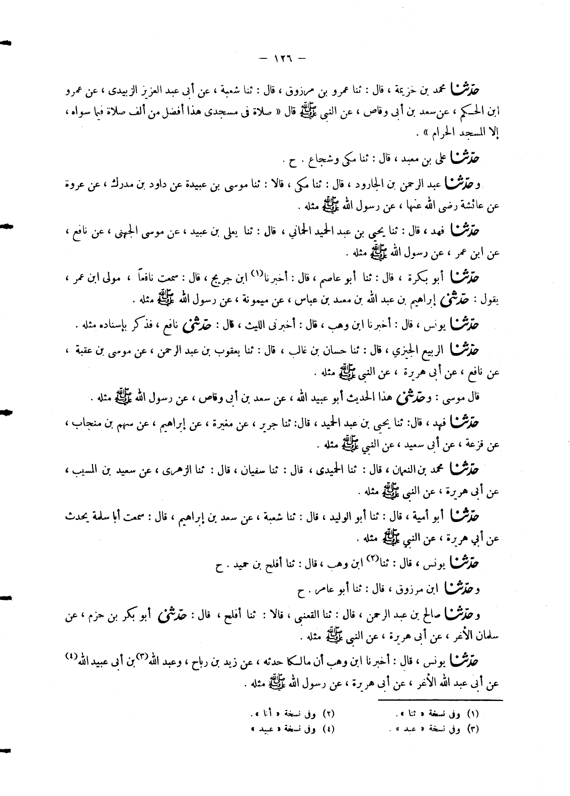 4781 - حَدَّثَنَا مُحَمَّدُ بْنُ خُزَيْمَةَ قَالَ: ثنا عَمْرُو بْنُ مَرْزُوقٍ قَالَ: ثنا شُعْبَةُ عَنْ أَبِي عَبْدِ الْعَزِيزِ الرَّبَذِيِّ، عَنْ عُمَرَ بْنِ الْحَكَمِ عَنْ سَعْدِ بْنِ أَبِي وَقَّاصٍ عَنِ النَّبِيِّ صَلَّى اللَّهُ عَلَيْهِ وَسَلَّمَ قَالَ: «§صَلَاةٌ فِي مَسْجِدِي هَذَا أَفْضَلُ مِنْ أَلْفِ صَلَاةٍ فِيمَا سِوَاهُ إِلَّا الْمَسْجِدَ الْحَرَامَ» .