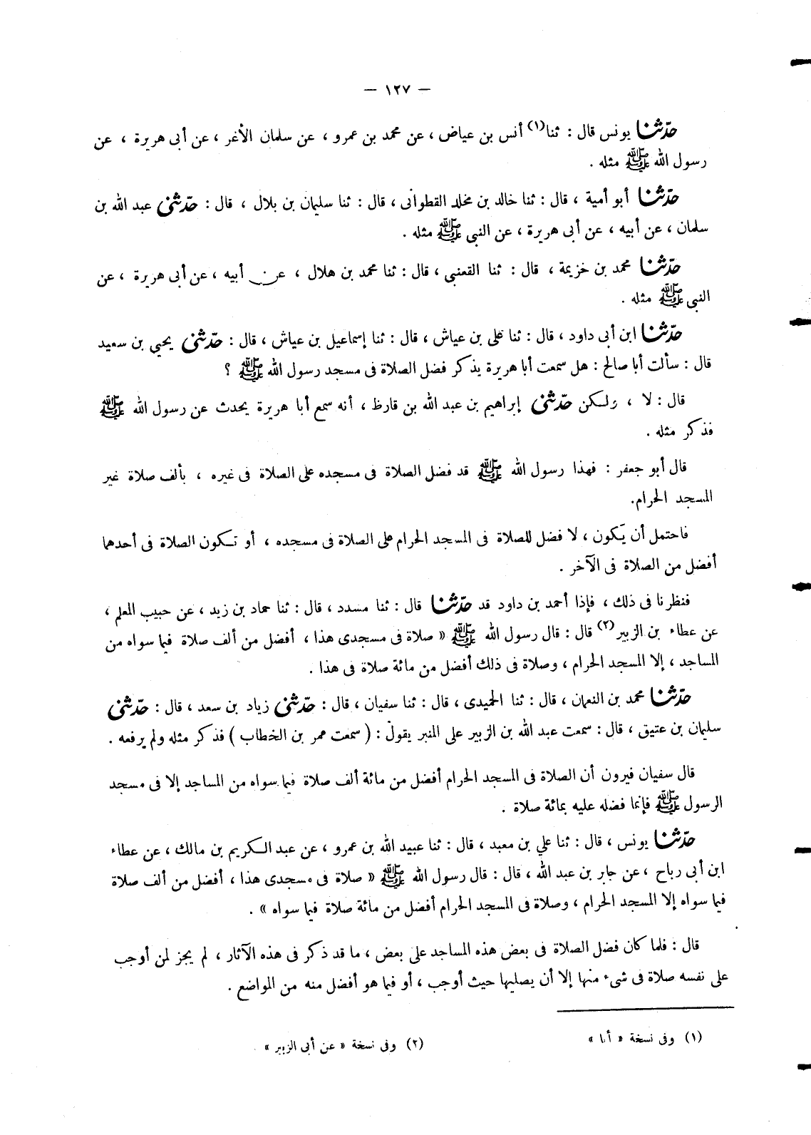 4801 - حَدَّثَنَا مُحَمَّدُ بْنُ النُّعْمَانِ , قَالَ: ثنا الْحُمَيْدِيُّ , قَالَ: ثنا سُفْيَانُ , قَالَ: حَدَّثَنِي زِيَادُ بْنُ سَعْدٍ , قَالَ: حَدَّثَنِي سُلَيْمَانُ بْنُ عَتِيقٍ , قَالَ: سَمِعْتُ عَبْدَ اللهِ بْنَ الزُّبَيْرِ , عَلَى الْمِنْبَرِ يَقُولُ: سَمِعْتُ عُمَرَ بْنَ الْخَطَّابِ , فَذَكَرَ مِثْلَهُ وَلَمْ يَرْفَعْهُ قَالَ سُفْيَانُ فَيَرَوْنَ أَنَّ الصَّلَاةَ فِي الْمَسْجِدِ الْحَرَامِ أَفْضَلُ مِنْ مِائَةِ أَلْفِ صَلَاةٍ فِيمَا سِوَاهُ مِنَ الْمَسَاجِدِ إِلَّا فِي مَسْجِدِ الرَّسُولِ صَلَّى اللَّهُ عَلَيْهِ وَسَلَّمَ فَإِنَّمَا فَضَّلَهُ عَلَيْهِ بِمِائَةِ صَلَاةٍ