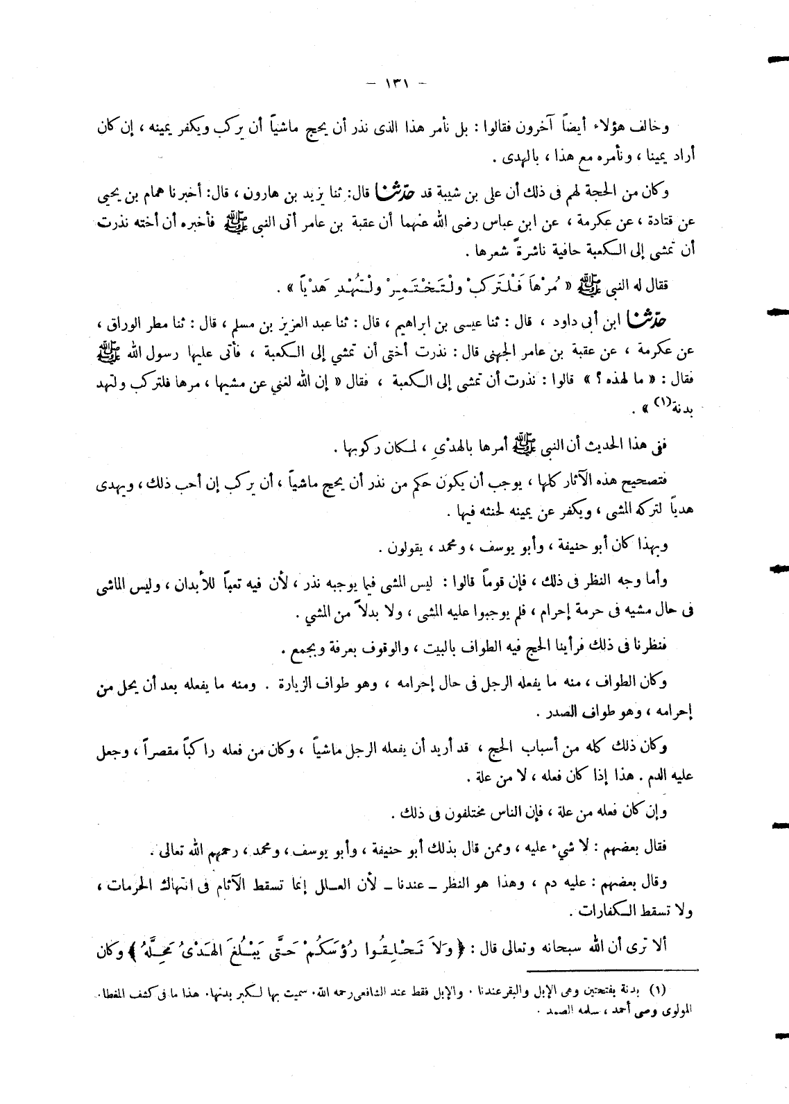 4821 - حَدَّثَنَا ابْنُ أَبِي دَاوُدَ , قَالَ: ثنا عِيسَى بْنُ إِبْرَاهِيمَ , قَالَ: ثنا عَبْدُ الْعَزِيزِ بْنُ مُسْلِمٍ , قَالَ: ثنا مَطَرٌ الْوَرَّاقُ , عَنْ عِكْرِمَةَ , " عَنْ عُقْبَةَ بْنِ عَامِرٍ الْجُهَنِيِّ , قَالَ: نَذَرَتْ أُخْتِي أَنْ تَمْشِيَ , إِلَى الْكَعْبَةِ فَأَتَى عَلَيْهَا رَسُولُ اللهِ صَلَّى اللَّهُ عَلَيْهِ وَسَلَّمَ فَقَالَ: مَا لِهَذِهِ؟ قَالُوا: نَذَرَتْ أَنْ تَمْشِيَ إِلَى الْكَعْبَةِ فَقَالَ إِنَّ اللهَ لَغَنِيٌّ عَنْ مَشْيِهَا §مُرْهَا فَلْتَرْكَبْ وَلِتُهْدِ بَدَنَةً " فَفِي هَذَا الْحَدِيثِ أَنَّ النَّبِيَّ صَلَّى اللَّهُ عَلَيْهِ وَسَلَّمَ أَمَرَهَا بِالْهَدْيِ لِمَكَانِ رُكُوبِهَا. فَتَصْحِيحُ هَذِهِ الْآثَارِ كُلِّهَا يُوجِبُ أَنْ يَكُونَ حُكْمُ مَنْ نَذَرَ أَنْ يَحُجَّ مَاشِيًا أَنْ يَرْكَبَ إِنْ أَحَبَّ ذَلِكَ وَيُهْدِيَ هَدْيًا لِتَرْكِهِ الْمَشْيَ , وَيُكَفِّرَ عَنْ يَمِينِهِ لِحِنْثِهِ فِيهَا. وَبِهَذَا كَانَ أَبُو حَنِيفَةَ وَأَبُو يُوسُفَ , وَمُحَمَّدٌ , يَقُولُونَ. وَأَمَّا وَجْهُ النَّظَرِ فِي ذَلِكَ , فَإِنَّ قَوْمًا قَالُوا: لَيْسَ الْمَشْيُ فِيمَا يُوجِبُهُ نَذْرٌ لِأَنَّ فِيهِ تَعَبًا لِلْأَبْدَانِ وَلَيْسَ الْمَاشِي فِي حَالِ مَشْيِهِ فِي حُرْمَةِ إِحْرَامٍ , فَلَمْ يُوجِبُوا عَلَيْهِ الْمَشْيَ وَلَا بَدَلًا مِنَ الْمَشْيِ. فَنَظَرْنَا فِي ذَلِكَ فَرَأَيْنَا الْحَجَّ فِيهِ الطَّوَافُ بِالْبَيْتِ وَالْوُقُوفُ بِعَرَفَةَ وَبِجَمْعٍ. وَكَانَ الطَّوَافُ مِنْهُ مَا يَفْعَلُهُ الرَّجُلُ فِي حَالِ إِحْرَامِهِ وَهُوَ طَوَافُ الزِّيَارَةِ. وَمِنْهُ مَا يَفْعَلُهُ بَعْدَ أَنْ يَحِلَّ مِنْ إِحْرَامِهِ , وَهُوَ طَوَافُ الصَّدْرِ. وَكَانَ ذَلِكَ كُلُّهُ مِنْ أَسْبَابِ الْحَجِّ قَدْ أُرِيدَ أَنْ يَفْعَلَهُ الرَّجُلُ مَاشِيًا وَكَانَ مَنْ فَعَلَهُ رَاكِبًا مُقَصِّرًا وَجُعِلَ عَلَيْهِ الدَّمُ. هَذَا إِذَا كَانَ فَعَلَهُ لَا مِنْ عِلَّةٍ. وَإِنْ كَانَ فَعَلَهُ مِنْ عِلَّةٍ , فَإِنَّ النَّاسَ مُخْتَلِفُونَ فِي ذَلِكَ. فَقَالَ بَعْضُهُمْ: لَا شَيْءَ عَلَيْهِ وَمِمَّنْ قَالَ بِذَلِكَ أَبُو حَنِيفَةَ وَأَبُو يُوسُفَ وَمُحَمَّدٌ رَحِمَهُمُ اللهُ تَعَالَى وَقَالَ بَعْضُهُمْ: عَلَيْهِ دَمٌ وَهَذَا هُوَ النَّظَرُ - عِنْدَنَا - لِأَنَّ الْعِلَلَ إِنَّمَا تُسْقِطُ الْآثَامَ فِي انْتِهَاكِ الْحُرُمَاتِ , وَلَا تُسْقِطُ الْكَفَّارَاتِ. أَلَا تَرَى أَنَّ اللهَ سُبْحَانَهُ وَتَعَالَى قَالَ: «وَلَا تَحْلِقُوا رُءُوسَكُمْ حَتَّى يَبْلُغَ الْهَدْيُ مَحِلَّهُ» وَكَانَ -[132]- حَلْقُ الرَّأْسِ حَرَامًا عَلَى الْمُحْرِمِ فِي إِحْرَامِهِ إِلَّا مِنْ عُذْرٍ فَإِنْ حَلَقَهُ فَعَلَيْهِ الْإِثْمُ وَالْكَفَّارَةُ , وَإِنِ اضْطُرَّ إِلَى حَلْقِهِ فَعَلَيْهِ الْكَفَّارَةُ وَلَا إِثْمَ عَلَيْهِ. فَكَانَ الْعُذْرُ يَسْقُطُ بِهِ الْآثَامُ , وَلَا يَسْقُطُ بِهِ الْكَفَّارَاتُ فَكَانَ يَجِبُ فِي النَّظَرِ أَنْ يَكُونَ كَذَلِكَ حُكْمُ الطَّوَافِ بِالْبَيْتِ إِذَا كَانَ مَنْ طَافَهُ رَاكِبًا لِلزِّيَارَةِ لَا مِنْ عُذْرٍ فَعَلَيْهِ دَمٌ إِلَّا أَنْ يَكُونَ مَنْ طَافَهُ مِنْ عُذْرٍ رَاكِبًا كَذَلِكَ أَيْضًا. فَهَذَا حُكْمُ النَّظَرِ فِي هَذَا الْبَابِ وَهُوَ قِيَاسُ قَوْلِ زُفَرَ. وَلَكِنَّ أَبَا حَنِيفَةَ وَأَبَا يُوسُفَ وَمُحَمَّدًا , لَمْ يَجْعَلُوا عَلَى مَنْ طَافَ بِالْبَيْتِ طَوَافَ الزِّيَارَةِ رَاكِبًا مِنْ عُذْرٍ شَيْئًا. فَلَمَّا ثَبَتَ بِالنَّظَرِ مَا ذَكَرْنَا كَانَ كَذَلِكَ الْمَشْيُ لِمَا رَأَيْنَاهُ , قَدْ يَجِبُ بَعْدَ فَرَاغِ الْإِحْرَامِ إِذْ كَانَ مِنْ أَسْبَابِهِ كَمَا يَجِبُ فِي الْإِحْرَامِ , كَانَ كَذَلِكَ الْمَشْيُ الَّذِي قَبْلَ الْإِحْرَامِ مِنْ أَسْبَابِ ا