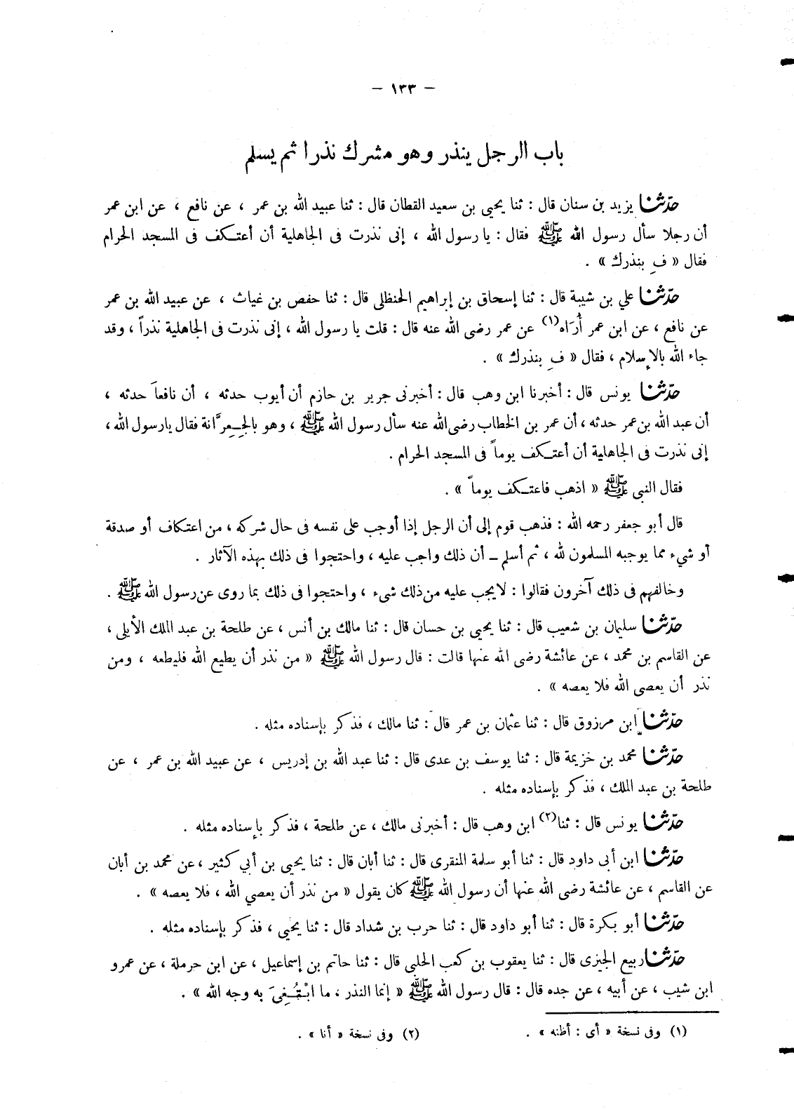 4824 - حَدَّثَنَا يُونُسُ , قَالَ أَخْبَرَنَا ابْنُ وَهْبٍ , قَالَ: أَخْبَرَنِي جَرِيرُ بْنُ حَازِمٍ , أَنَّ أَيُّوبَ , حَدَّثَهُ أَنَّ نَافِعًا حَدَّثَهُ , أَنَّ عَبْدَ اللهِ بْنَ عُمَرَ حَدَّثَهُ «أَنَّ عُمَرَ بْنَ الْخَطَّابِ رَضِيَ اللهُ عَنْهُ سَأَلَ رَسُولَ اللهِ صَلَّى اللَّهُ عَلَيْهِ وَسَلَّمَ وَهُوَ بِالْجِعْرَانَةِ فَقَالَ يَا رَسُولَ اللهِ , إِنِّي نَذَرْتُ فِي الْجَاهِلِيَّةِ أَنْ أَعْتَكِفَ يَوْمًا فِي الْمَسْجِدِ الْحَرَامِ. فَقَالَ النَّبِيُّ صَلَّى اللَّهُ عَلَيْهِ وَسَلَّمَ §اذْهَبْ فَاعْتَكِفْ يَوْمًا» قَالَ أَبُو جَعْفَرٍ رَحِمَهُ اللهُ: فَذَهَبَ قَوْمٌ إِلَى أَنَّ الرَّجُلَ إِذَا أَوْجَبَ عَلَى نَفْسِهِ فِي حَالِ شِرْكِهِ مِنِ اعْتِكَافٍ أَوْ صَدَقَةٍ أَوْ شَيْءٍ مِمَّا يُوجِبُهُ الْمُسْلِمُونَ لِلَّهِ، ثُمَّ أَسْلَمَ، أَنَّ ذَلِكَ وَاجِبٌ عَلَيْهِ , وَاحْتَجُّوا فِي ذَلِكَ بِهَذِهِ الْآثَارِ. وَخَالَفَهُمْ فِي ذَلِكَ آخَرُونَ فَقَالُوا: لَا يَجِبُ عَلَيْهِ مِنْ ذَلِكَ شَيْءٌ وَاحْتَجُّوا فِي ذَلِكَ بِمَا رُوِيَ عَنْ رَسُولِ اللهِ صَلَّى اللَّهُ عَلَيْهِ وَسَلَّمَ