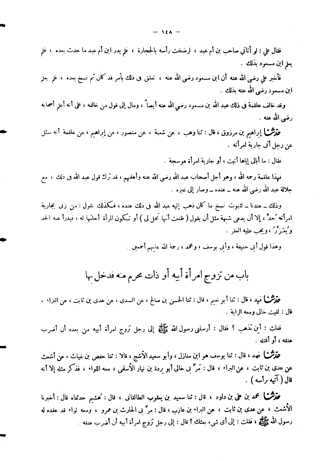 4881 - حَدَّثَنَا مُحَمَّدُ بْنُ عَلِيِّ بْنِ دَاوُدَ قَالَ: ثنا سَعِيدُ بْنُ يَعْقُوبَ الطَّالْقَانِيُّ قَالَ: هُشَيْمٌ حَدَّثَنَاهُ قَالَ أَخْبَرَنَا الْأَشْعَثُ , عَنْ عَدِيِّ بْنِ ثَابِتٍ , " عَنِ الْبَرَاءِ بْنِ عَازِبٍ , قَالَ: مَرَّ بِي الْحَارِثُ بْنُ عَمْرٍو , وَمَعَهُ لِوَاءٌ قَدْ عَقَدَهُ لَهُ رَسُولُ اللهِ صَلَّى اللَّهُ عَلَيْهِ وَسَلَّمَ فَقُلْتُ: إِلَى أَيِّ شَيْءٍ بَعَثَكَ؟ قَالَ: §إِلَى رَجُلٍ تَزَوَّجَ امْرَأَةَ أَبِيهِ أَنْ أَضْرِبَ عُنُقَهُ " -[149]-