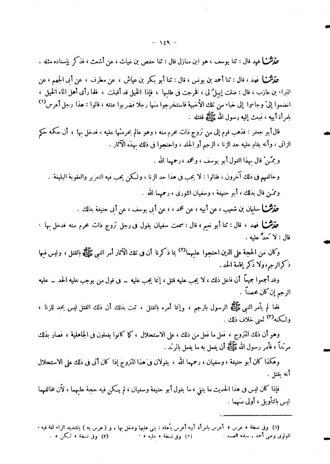4883 - حَدَّثَنَا فَهْدٌ , قَالَ: ثنا أَحْمَدُ بْنُ يُونُسَ , قَالَ: ثنا أَبُو بَكْرِ بْنُ عَيَّاشٍ , عَنْ مُطَّرِفٍ , عَنْ أَبِي الْجَهْمِ , " عَنِ الْبَرَاءِ بْنِ عَازِبٍ , قَالَ: ضَلَّتْ إِبِلٌ لِي فَخَرَجْتُ فِي طَلَبِهَا فَإِذَا الْخَيْلُ قَدْ أَقْبَلَتْ فَلَمَّا رَأَى أَهْلُ الْمَاءِ الْخَيْلَ انْضَمُّوا إِلَيَّ وَجَاءُوا إِلَى خِبَاءٍ مِنْ تِلْكَ الْأَخْبِيَةِ فَاسْتَخْرَجُوا مِنْهَا رَجُلًا فَضَرَبُوا عُنُقَهُ قَالُوا: §هَذَا رَجُلٌ أَعْرَسَ بِامْرَأَةِ أَبِيهِ , فَبَعَثَ إِلَيْهِ رَسُولُ اللهِ صَلَّى اللَّهُ عَلَيْهِ وَسَلَّمَ فَقَتَلَهُ ". قَالَ أَبُو جَعْفَرٍ: فَذَهَبَ قَوْمٌ إِلَى مَنْ تَزَوَّجَ ذَاتَ مَحْرَمٍ مِنْهُ وَهُوَ عَالِمٌ بِحُرْمَتِهَا عَلَيْهِ , فَدَخَلَ بِهَا أَنَّ حُكْمَهُ حُكْمُ الزَّانِي , وَأَنَّهُ يُقَامُ عَلَيْهِ حَدُّ الزِّنَا الرَّجْمُ أَوِ الْجَلْدُ وَاحْتَجُّوا فِي ذَلِكَ بِهَذِهِ الْآثَارِ. وَمِمَّنْ قَالَ بِهَذَا الْقَوْلِ أَبُو يُوسُفَ وَمُحَمَّدٌ رَحِمَهُمَّا اللهُ. وَخَالَفَهُمْ فِي ذَلِكَ آخَرُونَ , فَقَالُوا: لَا يَجِبُ فِي هَذَا حَدُّ الزِّنَا , وَلَكِنْ يَجِبُ فِيهِ التَّعْزِيرُ وَالْعُقُوبَةُ الْبَلِيغَةُ. وَمِمَّنْ قَالَ بِذَلِكَ أَبُو حَنِيفَةَ وَسُفْيَانُ الثَّوْرِيُّ رَحِمَهُمَا اللهُ.