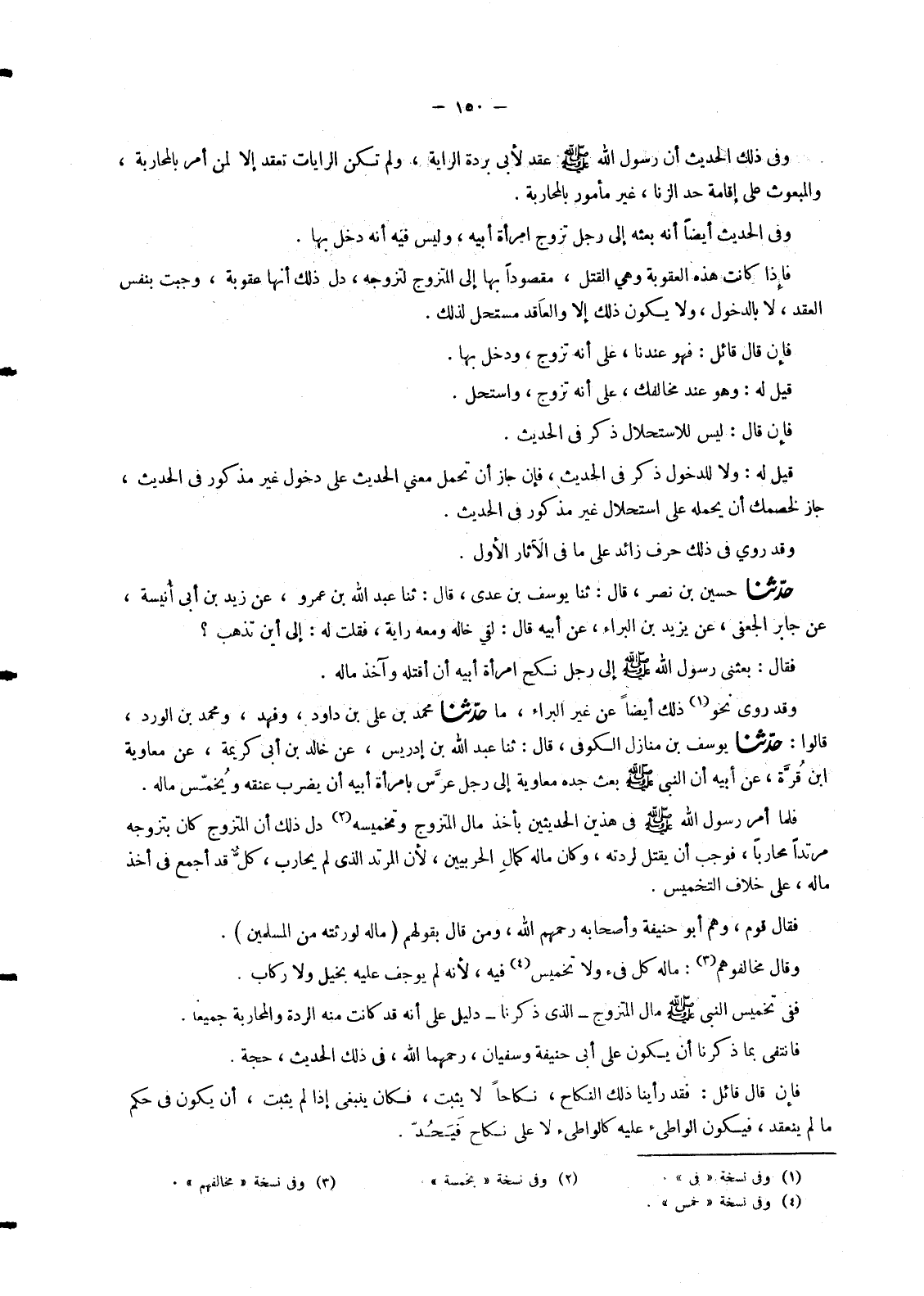 4887 - حَدَّثَنَا مُحَمَّدُ بْنُ عَلِيِّ بْنِ دَاوُدَ , وَفَهْدٌ وَمُحَمَّدُ بْنُ الْوَرْدِ قَالُوا: حَدَّثَنَا يُوسُفُ بْنُ مُنَازِلٍ الْكُوفِيُّ قَالَ: ثنا عَبْدُ اللهِ بْنُ إِدْرِيسَ عَنْ خَالِدِ بْنِ أَبِي كَرِيمَةَ عَنْ مُعَاوِيَةَ بْنِ قُرَّةَ عَنْ أَبِيهِ «أَنَّ النَّبِيَّ صَلَّى اللَّهُ عَلَيْهِ وَسَلَّمَ بَعَثَ جَدَّهُ مُعَاوِيَةَ إِلَى رَجُلٍ §عَرَّسَ بِامْرَأَةِ أَبِيهِ أَنْ يَضْرِبَ عُنُقَهُ وَيُخَمِّسَ مَالَهُ» فَلَمَّا أَمَرَ رَسُولُ اللهِ صَلَّى اللَّهُ عَلَيْهِ وَسَلَّمَ فِي هَذَيْنِ الْحَدِيثَيْنِ بِأَخْذِ مَالِ الْمُتَزَوِّجِ وَتَخْمِيسِهِ دَلَّ ذَلِكَ أَنَّ الْمُتَزَوِّجَ كَانَ بِتَزَوُّجِهِ مُرْتَدًّا مُحَارِبًا فَوَجَبَ أَنْ يُقْتَلَ لِرِدَّتِهِ , وَكَانَ مَالُهُ كَمَالِ الْحَرْبِيِّينَ لِأَنَّ الْمُرْتَدَّ الَّذِي لَمْ يُحَارِبْ كُلٌّ قَدْ أَجْمَعَ فِي أَخْذِ مَالِهِ , عَلَى خِلَافِ التَّخْمِيسِ. فَقَالَ قَوْمٌ وَهُمْ أَبُو حَنِيفَةَ وَأَصْحَابُهُ رَحِمَهُمُ اللهُ وَمَنْ قَالَ بِقَوْلِهِمْ مَالُهُ لِوَرَثَتِهِ مِنَ الْمُسْلِمِينَ. وَقَالَ مُخَالِفُوهُمْ: مَالُهُ كُلٌّ فَيْءٌ وَلَا تَخْمِيسَ فِيهِ لِأَنَّهُ لَمْ يُوجِفْ عَلَيْهِ بِخَيْلٍ وَلَا رِكَابٍ. فَفِي تَخْمِيسِ النَّبِيِّ صَلَّى اللَّهُ عَلَيْهِ وَسَلَّمَ مَالَ الْمُتَزَوِّجِ - الَّذِي ذَكَرْنَا - دَلِيلٌ عَلَى أَنَّهُ قَدْ كَانَتْ مِنْهُ الرِّدَّةُ وَالْمُحَارَبَةُ جَمِيعًا. فَانْتَفَى بِمَا ذَكَرْنَا أَنْ يَكُونَ عَلَى أَبِي حَنِيفَةَ وَسُفْيَانَ رَحِمَهُمَا اللهُ فِي ذَلِكَ الْحَدِيثِ حُجَّةٌ. فَإِنْ قَالَ قَائِلٌ: فَقَدْ رَأَيْنَا ذَلِكَ النِّكَاحَ نِكَاحًا لَا يَثْبُتُ فَكَانَ يَنْبَغِي إِذَا لَمْ يَثْبُتْ أَنْ يَكُونَ فِي حُكْمِ مَا لَمْ يَنْعَقِدْ فَيَكُونُ الْوَاطِئُ عَلَيْهِ كَالْوَاطِئِ لَا عَلَى نِكَاحٍ فَيُحَدُّ. -[151]- قِيلَ لَهُ: إِنْ كَانَ ذَلِكَ كَذَلِكَ , فَلِمَ كَانَ سُؤَالُكَ إِيَّانَا مَا ذَكَرْتُ ذِكْرَ التَّزْوِيجِ كَانَ يَنْبَغِي أَنْ تَقُولَ رَجُلٌ زَنَى بِذَاتِ مَحْرَمٍ مِنْهُ. فَإِنْ قُلْتُ ذَلِكَ كَانَ جَوَابُنَا لَكَ أَنْ نَقُولَ: عَلَيْهِ الْحَدُّ وَإِنْ أَطْلَقْتُ اسْمَ التَّزَوُّجِ , وَسَمَّيْتُ ذَلِكَ النِّكَاحَ نِكَاحًا وَإِنْ لَمْ يَكُنْ ثَابِتًا فَلَا حَدَّ عَلَى وَاطِئٍ عَلَى نِكَاحٍ جَائِزٍ وَلَا فَاسِدٍ. وَقَدْ رَأَيْنَا عُمَرَ بْنَ الْخَطَّابِ رَضِيَ اللهُ عَنْهُ , قَضَى فِي الْمُتَزَوِّجِ فِي الْعِدَّةِ الَّتِي لَا يَثْبُتُ فِيهَا نِكَاحُ الْوَاطِئِ عَلَى ذَلِكَ مَا يَدُلُّ عَلَى خِلَافِ مَذْهَبِكَ. وَذَلِكَ أَنَّ