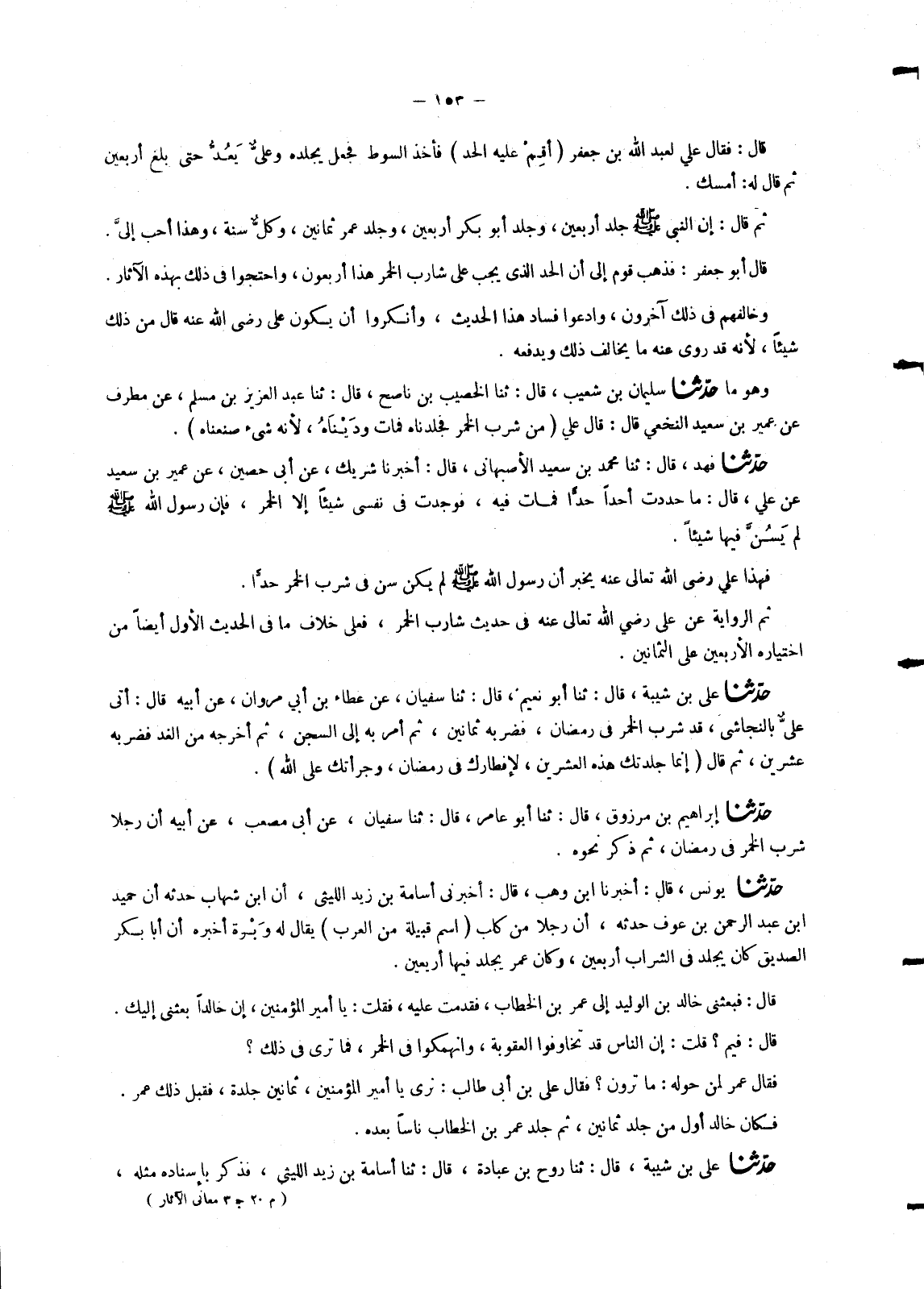 4898 - حَدَّثَنَا عَلِيُّ بْنُ شَيْبَةَ , قَالَ: ثنا رَوْحُ بْنُ عُبَادَةَ , قَالَ: ثنا أُسَامَةُ بْنُ زَيْدٍ اللَّيْثِيُّ , فَذَكَرَ بِإِسْنَادِهِ مِثْلَهُ -[154]- غَيْرَ أَنَّهُ قَالَ فَأَتَيْتُ عُمَرَ فَوَجَدَتْ عِنْدَهُ عَلِيًّا , وَطَلْحَةَ وَالزُّبَيْرَ أَوْ عَبْدَ الرَّحْمَنِ بْنَ عَوْفٍ وَهُمْ مُتَّكِئُونَ فِي الْمَسْجِدِ فَذَكَرَ مِثْلَ مَا فِي حَدِيثِ يُونُسَ. غَيْرَ أَنَّهُ زَادَ فِي كَلَامِ عَلِيٍّ أَنَّهُ قَالَ إِذَا سَكِرَ هَذَى وَإِذَا هَذَى افْتَرَى وَعَلَى الْمُفْتَرِي ثَمَانُونَ وَتَابَعَهُ أَصْحَابُهُ ثُمَّ ذَكَرَ الْحَدِيثَ أَفَلَا تَرَى أَنَّ عَلِيًّا رَضِيَ اللهُ عَنْهُ لَمَّا سُئِلَ عَنْ ذَلِكَ , ضَرَبَ أَمْثَالَ الْحُدُودِ كَيْفَ هِيَ ثُمَّ اسْتَخْرَجَ مِنْهَا حَدًّا بِرَأْيِهِ , فَجَعَلَهُ كَحَدِّ الْمُفْتَرِي. وَلَوْ كَانَ عِنْدَهُ فِي ذَلِكَ شَيْءٌ مُوَقَّتٌ عَنِ النَّبِيِّ صَلَّى اللَّهُ عَلَيْهِ وَسَلَّمَ لَأَغْنَاهُ عَنْ ذَلِكَ وَلَوْ كَانَ عِنْدَ أَصْحَابِهِ رَضِيَ اللهُ عَنْهُمْ فِي ذَلِكَ أَيْضًا عَنِ النَّبِيِّ صَلَّى اللَّهُ عَلَيْهِ وَسَلَّمَ شَيْءٌ إِذًا لَأَنْكَرُوا عَلَيْهِ أَخْذَ ذَلِكَ مِنْ جِهَةِ الِاسْتِنْبَاطِ وَضَرْبِ الْأَمْثَالِ. فَدَلَّ مَا ذَكَرْنَا مِنْهُ وَمِنْهُمْ أَنَّهُ لَمْ يَكُنْ عِنْدَهُمْ فِي ذَلِكَ عَنْ رَسُولِ اللهِ صَلَّى اللَّهُ عَلَيْهِ وَسَلَّمَ شَيْءٌ فَكَيْفَ يَجُوزُ أَنْ يُقْبَلَ بَعْدَ هَذَا عَنْ عَلِيٍّ رَضِيَ اللهُ تَعَالَى عَنْهُ , مَا يُخَالِفُ هَذَا؟
