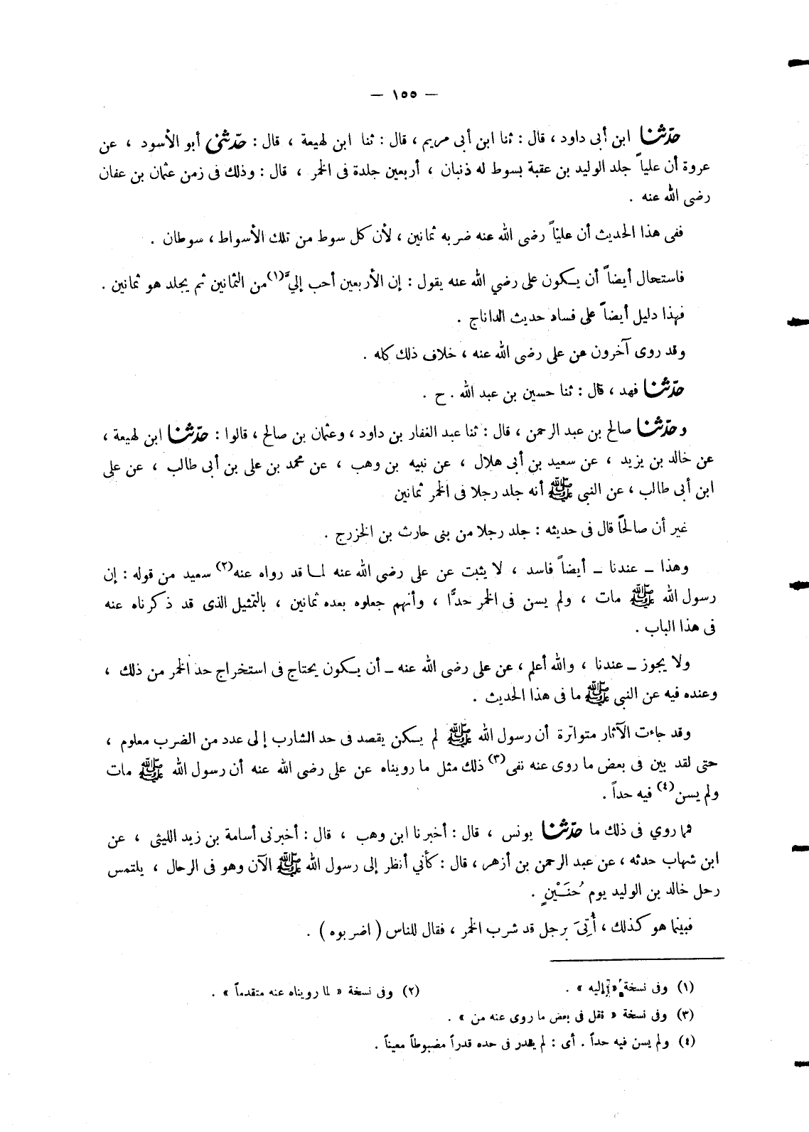 4903 - وَحَدَّثَنَا صَالِحُ بْنُ عَبْدِ الرَّحْمَنِ , قَالَ: ثنا عَبْدُ الْغَفَّارِ بْنُ دَاوُدَ , وَعُثْمَانُ بْنُ صَالِحٍ , قَالُوا: حَدَّثَنَا ابْنُ لَهِيعَةَ , عَنْ خَالِدِ بْنِ يَزِيدَ , عَنْ سَعِيدِ بْنِ أَبِي هِلَالٍ , عَنْ نَبِيهِ بْنِ وَهْبٍ , عَنْ مُحَمَّدِ بْنِ عَلِيِّ بْنِ أَبِي طَالِبٍ , عَنْ عَلِيِّ بْنِ أَبِي طَالِبٍ , " عَنِ النَّبِيِّ صَلَّى اللَّهُ عَلَيْهِ وَسَلَّمَ أَنَّهُ §جَلَدَ رَجُلًا فِي الْخَمْرِ ثَمَانِينَ غَيْرَ أَنَّ صَالِحًا قَالَ فِي حَدِيثِهِ: جَلَدَ رَجُلًا مِنْ بَنِي حَارِثِ بْنِ الْخَزْرَجِ " وَهَذَا - عِنْدَنَا - أَيْضًا فَاسِدٌ لَا يَثْبُتُ عَنْ عَلِيٍّ رَضِيَ اللهُ عَنْهُ لِمَا قَدْ رَوَاهُ عَنْهُ سَعِيدٌ مِنْ قَوْلِهِ: «إِنَّ رَسُولَ اللهِ صَلَّى اللَّهُ عَلَيْهِ وَسَلَّمَ مَاتَ وَلَمْ يُسِنَّ فِي الْخَمْرِ حَدًّا» , وَأَنَّهُمْ جَعَلُوهُ بَعْدَهُ ثَمَانِينَ , بِالتَّمْثِيلِ الَّذِي قَدْ ذَكَرْنَاهُ عَنْهُ فِي هَذَا الْبَابِ. وَلَا يَجُوزُ - عِنْدَنَا وَاللهُ أَعْلَمُ عَنْ عَلِيٍّ رَضِيَ اللهُ عَنْهُ - أَنْ يَكُونَ يَحْتَاجُ فِي اسْتِخْرَاجِ حَدِّ الْخَمْرِ مِنْ ذَلِكَ , وَعِنْدَهُ فِيهِ عَنِ النَّبِيِّ صَلَّى اللَّهُ عَلَيْهِ وَسَلَّمَ مَا فِي هَذَا الْحَدِيثِ. وَقَدْ جَاءَتِ الْآثَارُ مُتَوَاتِرَةً «أَنَّ رَسُولَ اللهِ صَلَّى اللَّهُ عَلَيْهِ وَسَلَّمَ لَمْ يَكُنْ يَقْصِدُ فِي حَدِّ الشَّارِبِ إِلَى عَدَدٍ مِنَ الضَّرْبِ مَعْلُومٍ» حَتَّى لَقَدْ بَيَّنَ فِي بَعْضِ مَا رُوِيَ عَنْهُ نَفْيَ ذَلِكَ مِثْلُ مَا رَوَيْنَاهُ عَنْ عَلِيٍّ رَضِيَ اللهُ عَنْهُ «أَنَّ رَسُولَ اللهِ صَلَّى اللَّهُ عَلَيْهِ وَسَلَّمَ مَاتَ وَلَمْ يُسِنَّ فِيهِ حَدًّا» فَمِمَّا رُوِيَ فِي ذَلِكَ مَا
