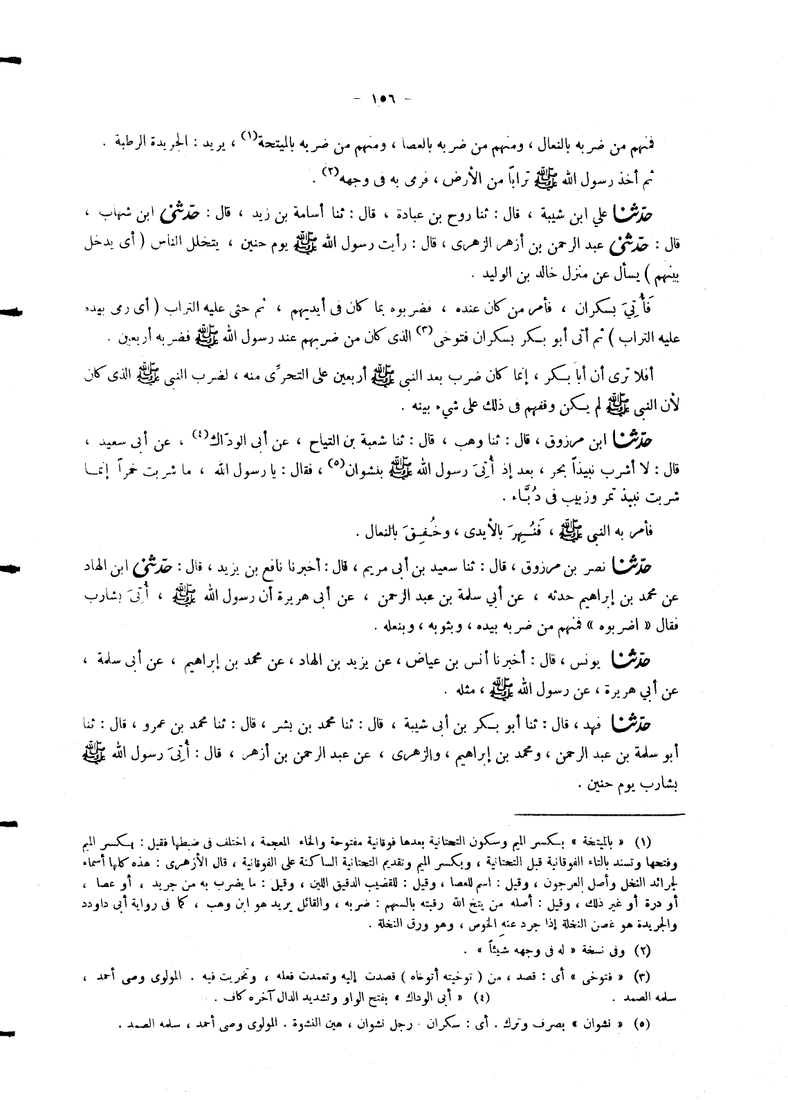 4909 - حَدَّثَنَا فَهْدٌ , قَالَ: ثنا أَبُو بَكْرِ بْنُ أَبِي شَيْبَةَ , قَالَ: ثنا مُحَمَّدُ بْنُ بِشْرٍ , قَالَ: ثنا مُحَمَّدُ بْنُ عَمْرٍو , قَالَ: ثنا أَبُو سَلَمَةَ بْنُ عَبْدِ الرَّحْمَنِ , وَمُحَمَّدُ بْنُ إِبْرَاهِيمَ , وَالزُّهْرِيُّ , عَنْ عَبْدِ الرَّحْمَنِ بْنِ أَزْهَرَ , قَالَ: «أُتِيَ رَسُولُ اللهِ صَلَّى اللَّهُ عَلَيْهِ وَسَلَّمَ بِشَارِبٍ يَوْمَ حُنَيْنٍ. -[157]- فَقَالَ رَسُولُ اللهِ صَلَّى اللَّهُ عَلَيْهِ وَسَلَّمَ لِلنَّاسِ §قُومُوا إِلَيْهِ فَقَامَ النَّاسُ , فَضَرَبُوهُ بِنِعَالِهِمْ»