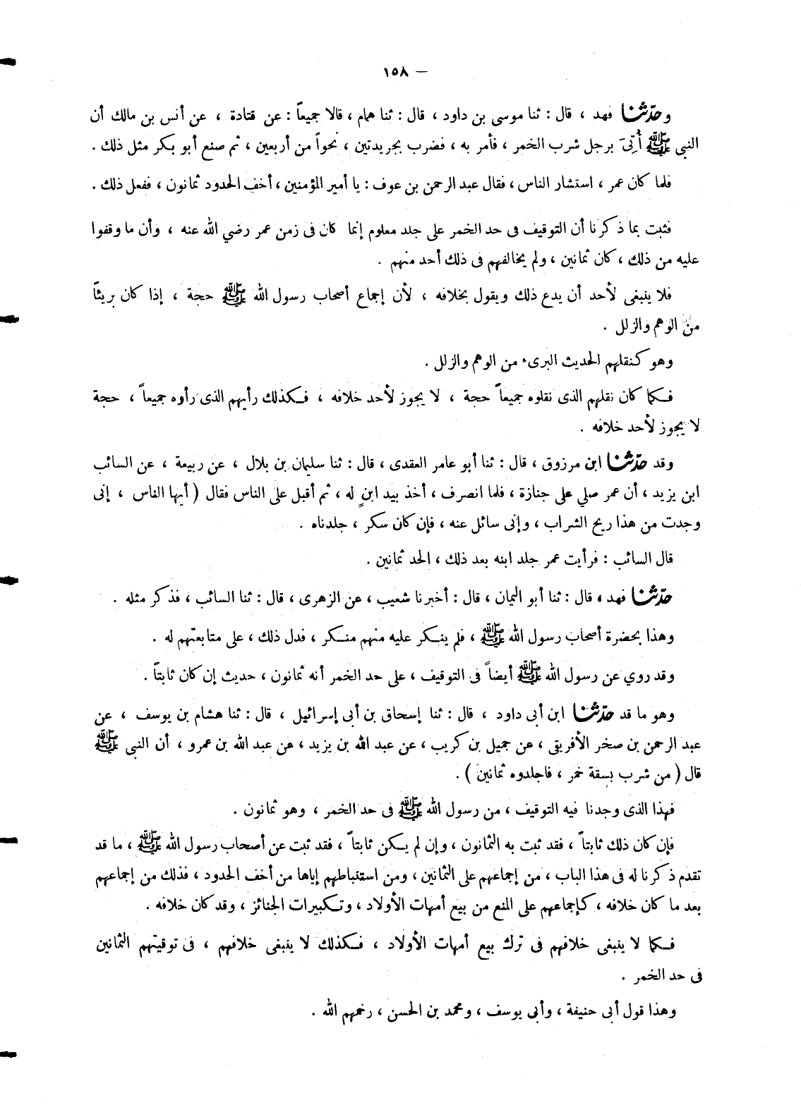 4919 - حَدَّثَنَا ابْنُ أَبِي دَاوُدَ قَالَ: ثنا إِسْحَاقُ بْنُ أَبِي إِسْرَائِيلَ قَالَ: ثنا هِشَامُ بْنُ يُوسُفَ عَنْ عَبْدِ الرَّحْمَنِ بْنِ صَخْرٍ الْأَفْرِيقِيِّ عَنْ جَمِيلِ بْنِ كُرَيْبٍ , عَنْ عَبْدِ اللهِ بْنِ يَزِيدَ عَنْ عَبْدِ اللهِ بْنِ عَمْرٍو أَنَّ النَّبِيَّ صَلَّى اللَّهُ عَلَيْهِ وَسَلَّمَ قَالَ «§مَنْ شَرِبَ بَسْقَةَ خَمْرٍ , فَاجْلِدُوهُ ثَمَانِينَ» فَهَذَا الَّذِي وَجَدْنَا فِيهِ التَّوْقِيفَ مِنْ رَسُولِ اللهِ صَلَّى اللَّهُ عَلَيْهِ وَسَلَّمَ فِي حَدِّ الْخَمْرِ وَهُوَ ثَمَانُونَ. فَإِنْ كَانَ ذَلِكَ ثَابِتًا فَقَدْ ثَبَتَ بِهِ الثَّمَانُونَ , وَإِنْ لَمْ يَكُنْ ثَابِتًا , فَقَدْ ثَبَتَ عَنْ أَصْحَابِ رَسُولِ اللهِ صَلَّى اللَّهُ عَلَيْهِ وَسَلَّمَ مَا قَدْ تَقَدَّمَ ذِكْرُنَا لَهُ فِي هَذَا الْبَابِ مِنْ إِجْمَاعِهِمْ عَلَى الثَّمَانِينَ وَمِنِ اسْتِنْبَاطِهِمْ إِيَّاهَا مِنْ أَخَفِّ الْحُدُودِ , فَذَلِكَ مِنْ إِجْمَاعِهِمْ بَعْدَمَا كَانَ خِلَافَهُ كَإِجْمَاعِهِمْ عَلَى الْمَنْعِ مِنْ بَيْعِ أُمَّهَاتِ الْأَوْلَادِ , وَتَكْبِيرَاتِ الْجَنَائِزِ , وَقَدْ كَانَ خِلَافَهُ. فَكَمَا لَا يَنْبَغِي خِلَافُهُمْ فِي تَرْكِ بَيْعِ أُمَّهَاتِ الْأَوْلَادِ , فَكَذَلِكَ لَا يَنْبَغِي خِلَافُهُمْ فِي تَوْقِيتِهِمِ الثَّمَانِينَ فِي حَدِّ الْخَمْرِ. وَهَذَا قَوْلُ أَبِي حَنِيفَةَ وَأَبِي يُوسُفَ وَمُحَمَّدِ بْنِ الْحَسَنِ رَحِمَهُمُ اللهُ