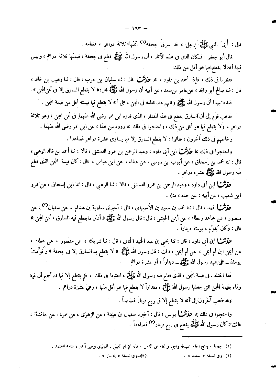 4950 - قَدْ حَدَّثَنَا قَالَ: ثنا سُلَيْمَانُ بْنُ حَرْبٍ , قَالَ: ثنا وُهَيْبُ بْنُ خَالِدٍ , قَالَ: ثنا صَالِحٌ أَبُو وَاقِدٍ , عَنْ عَامِرِ بْنِ سَعْدٍ , عَنْ أَبِيهِ أَنَّ رَسُولَ اللهِ صَلَّى اللَّهُ عَلَيْهِ وَسَلَّمَ قَالَ: «§لَا يُقْطَعُ السَّارِقُ إِلَّا فِي ثَمَنِ الْمِجَنِّ» . فَعَلِمْنَا بِهَذَا أَنَّ رَسُولَ اللهِ صَلَّى اللَّهُ عَلَيْهِ وَسَلَّمَ وَقَفَهُمْ عِنْدَ قَطْعِهِ فِي الْمِجَنِّ عَلَى أَنَّهُ لَا يُقْطَعُ فِيمَا قِيمَتُهُ أَقَلُّ مِنْ قِيمَةِ الْمِجَنِّ. فَذَهَبَ قَوْمٌ إِلَى أَنَّ السَّارِقَ يُقْطَعُ فِي هَذَا الْمِقْدَارِ , الَّذِي قَدَّرَهُ ابْنُ عُمَرَ رَضِيَ اللهُ عَنْهُمَا فِي ثَمَنِ الْمِجَنِّ , وَهُوَ ثَلَاثَةُ دَرَاهِمَ , وَلَا يُقْطَعُ فِيمَا هُوَ أَقَلُّ مِنْ ذَلِكَ , وَاحْتَجُّوا فِي ذَلِكَ بِمَا رَوَوْهُ مِنْ هَذَا عَنِ ابْنِ عُمَرَ رَضِيَ اللهُ عَنْهُمَا. وَخَالَفَهُمْ فِي ذَلِكَ آخَرُونَ , فَقَالُوا: لَا يُقْطَعُ السَّارِقُ إِلَّا فِيمَا يُسَاوِي عَشَرَةَ دَرَاهِمَ فَصَاعِدًا. وَاحْتَجُّوا فِي ذَلِكَ بِمَا