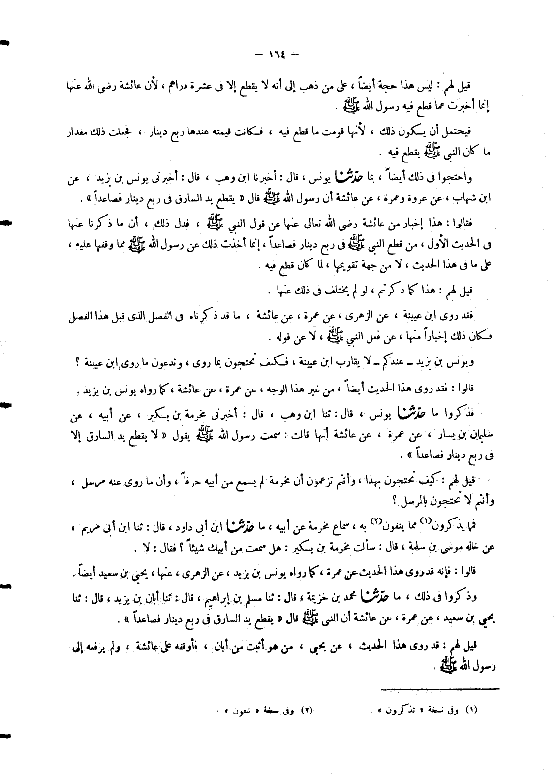 4956 - حَدَّثَنَا يُونُسُ , قَالَ: أَخْبَرَنَا ابْنُ وَهْبٍ , قَالَ: أَخْبَرَنِي يُونُسُ بْنُ يَزِيدَ , عَنِ ابْنِ شِهَابٍ , عَنْ عُرْوَةَ وَعَمْرَةَ , عَنْ عَائِشَةَ أَنَّ رَسُولَ اللهِ صَلَّى اللَّهُ عَلَيْهِ وَسَلَّمَ قَالَ «§يُقْطَعُ يَدُ السَّارِقِ فِي رُبْعِ دِينَارٍ فَصَاعِدًا» فَقَالُوا: هَذَا إِخْبَارٌ مِنْ عَائِشَةَ رَضِيَ اللهُ تَعَالَى عَنْهَا عَنْ قَوْلِ النَّبِيِّ صَلَّى اللَّهُ عَلَيْهِ وَسَلَّمَ , فَدَلَّ ذَلِكَ , أَنَّ مَا ذَكَرْنَا عَنْهَا فِي الْحَدِيثِ الْأَوَّلِ , مِنْ قَطْعِ النَّبِيِّ صَلَّى اللَّهُ عَلَيْهِ وَسَلَّمَ فِي رُبْعِ دِينَارٍ فَصَاعِدًا , إِنَّمَا أَخَذَتْ ذَلِكَ عَنْ رَسُولِ اللهِ صَلَّى اللَّهُ عَلَيْهِ وَسَلَّمَ مِمَّا وَقَفَهَا عَلَيْهِ عَلَى مَا فِي هَذَا الْحَدِيثِ , لَا مِنْ جِهَةِ تَقْوِيمِهَا ; لِمَا كَانَ قَطَعَ فِيهِ. قِيلَ لَهُمْ: هَذَا كَمَا ذَكَرْتُمْ , لَوْ لَمْ يَخْتَلِفْ فِي ذَلِكَ عَنْهَا فَقَدْ رَوَى ابْنُ عُيَيْنَةَ , عَنِ الزُّهْرِيِّ , عَنْ عَمْرَةَ , عَنْ عَائِشَةَ , مَا قَدْ ذَكَرْنَاهُ فِي الْفَصْلِ الَّذِي قَبْلَ هَذَا الْفَصْلِ فَكَانَ ذَلِكَ إِخْبَارًا مِنْهَا عَنْ فِعْلِ النَّبِيِّ صَلَّى اللَّهُ عَلَيْهِ وَسَلَّمَ , لَا عَنْ قَوْلِهِ وَيُونُسُ بْنُ يَزِيدَ - عِنْدَكُمْ - لَا يُقَارِبُ ابْنَ عُيَيْنَةَ , فَكَيْفَ تَحْتَجُّونَ بِمَا رَوَى , وَتَدَعُونَ مَا رَوَى ابْنُ عُيَيْنَةَ؟ قَالُوا: فَقَدْ رُوِيَ هَذَا الْحَدِيثُ أَيْضًا , مِنْ غَيْرِ هَذَا الْوَجْهِ عَنْ عَمْرَةَ , عَنْ عَائِشَةَ , كَمَا رَوَاهُ يُونُسُ بْنُ يَزِيدَ. فَذَكَرُوا مَا