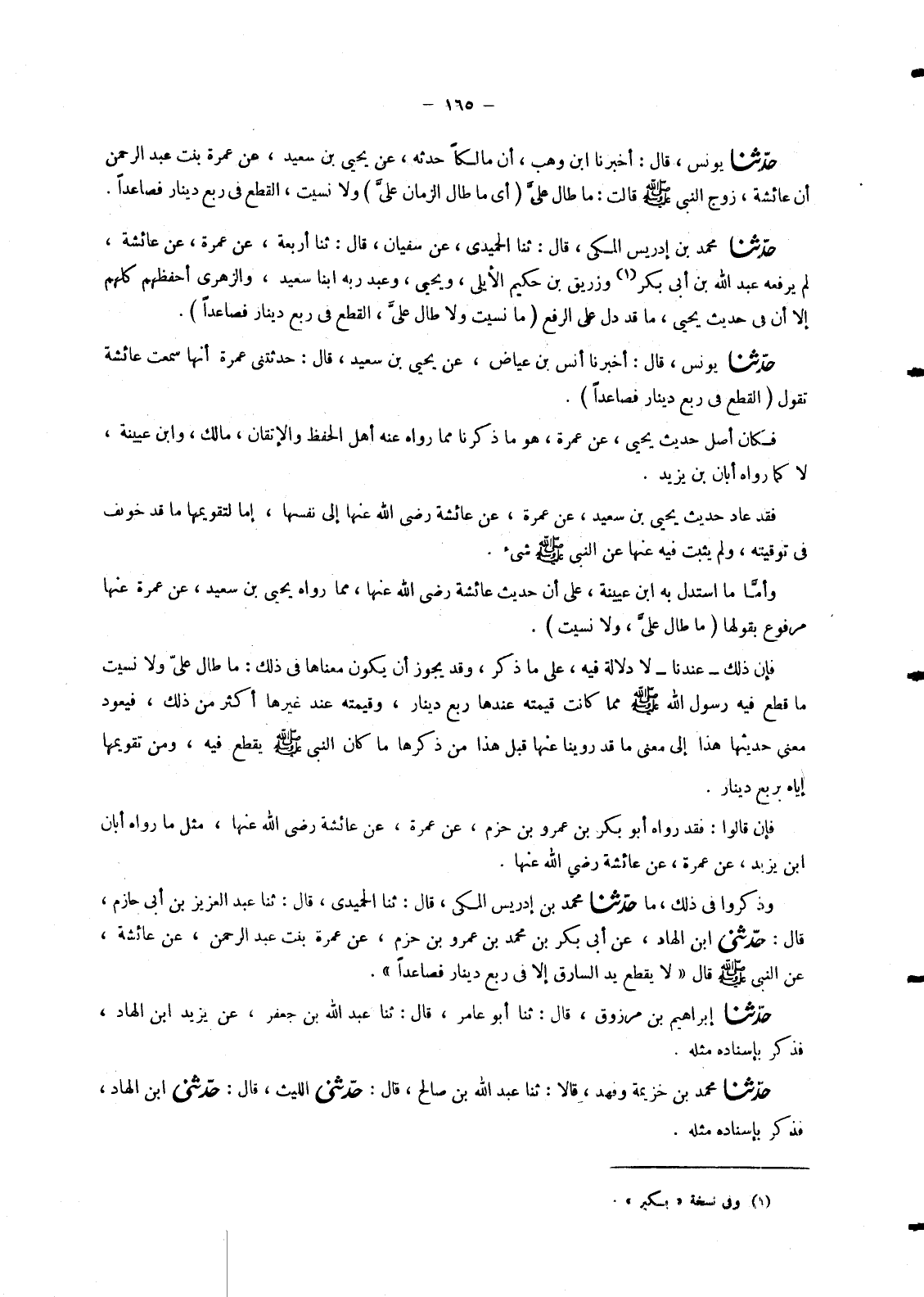 4962 - حَدَّثَنَا يُونُسُ , قَالَ أَخْبَرَنَا أَنَسُ بْنُ عِيَاضٍ , عَنْ يَحْيَى بْنِ سَعِيدٍ , قَالَ: حَدَّثَتْنِي عَمْرَةُ , أَنَّهَا سَمِعَتْ عَائِشَةَ , تَقُولُ §الْقَطْعُ فِي رُبْعِ دِينَارٍ فَصَاعِدًا فَكَانَ أَصْلُ حَدِيثِ يَحْيَى , عَنْ عَمْرَةَ هُوَ مَا ذَكَرْنَا مِمَّا رَوَاهُ عَنْهُ أَهْلُ الْحِفْظِ وَالْإِتْقَانِ مَالِكٌ , وَابْنُ عُيَيْنَةَ , لَا كَمَا رَوَاهُ أَبَانُ بْنُ يَزِيدَ. فَقَدْ عَادَ حَدِيثُ يَحْيَى بْنِ سَعِيدٍ , عَنْ عَمْرَةَ , عَنْ عَائِشَةَ رَضِيَ اللهُ عَنْهَا إِلَى نَفْسِهَا , إِمَّا لِتَقْوِيمِهَا مَا قَدْ خُولِفَ فِي تَوْقِيتِهِ , وَلَمْ يَثْبُتْ فِيهِ عَنْهَا عَنِ النَّبِيِّ صَلَّى اللَّهُ عَلَيْهِ وَسَلَّمَ شَيْءٌ. وَأَمَّا مَا اسْتَدَلَّ بِهِ ابْنُ عُيَيْنَةَ , عَلَى أَنَّ حَدِيثَ عَائِشَةَ رَضِيَ اللهُ عَنْهَا , مِمَّا رَوَاهُ يَحْيَى بْنُ سَعِيدٍ , عَنْ عَمْرَةَ عَنْهَا مَرْفُوعٌ بِقَوْلِهَا مَا طَالَ عَلَيَّ , وَلَا نَسِيتُ. فَإِنَّ ذَلِكَ - عِنْدَنَا - لَا دَلَالَةَ فِيهِ , عَلَى مَا ذُكِرَ , وَقَدْ يَجُوزُ أَنْ يَكُونَ مَعْنَاهَا فِي ذَلِكَ: مَا طَالَ عَلَيَّ وَلَا نَسِيتُ مَا قَطَعَ فِيهِ رَسُولُ اللهِ صَلَّى اللَّهُ عَلَيْهِ وَسَلَّمَ مِمَّا كَانَتْ قِيمَتُهُ عِنْدَهَا رُبْعَ دِينَارٍ , وَقِيمَتُهُ عِنْدَ غَيْرِهَا أَكْثَرَ مِنْ ذَلِكَ , فَيَعُودُ مَعْنَى حَدِيثِهَا هَذَا إِلَى مَعْنَى مَا قَدْ رَوَيْنَا عَنْهَا قَبْلَ هَذَا مِنْ ذِكْرِهَا مَا كَانَ النَّبِيُّ صَلَّى اللَّهُ عَلَيْهِ وَسَلَّمَ يَقْطَعُ فِيهِ , وَمِنْ تَقْوِيمِهَا إِيَّاهُ بِرُبْعِ دِينَارٍ. فَإِنْ قَالُوا: فَقَدْ رَوَاهُ أَبُو بَكْرِ بْنُ عَمْرِو بْنِ حَزْمٍ عَنْ عَمْرَةَ , عَنْ عَائِشَةَ رَضِيَ اللهُ عَنْهَا , مِثْلَ مَا رَوَاهُ أَبَانُ بْنُ يَزِيدَ , عَنْ عَمْرَةَ , عَنْ عَائِشَةَ رَضِيَ اللهُ عَنْهَا. وَذَكَرُوا فِي ذَلِكَ , مَا