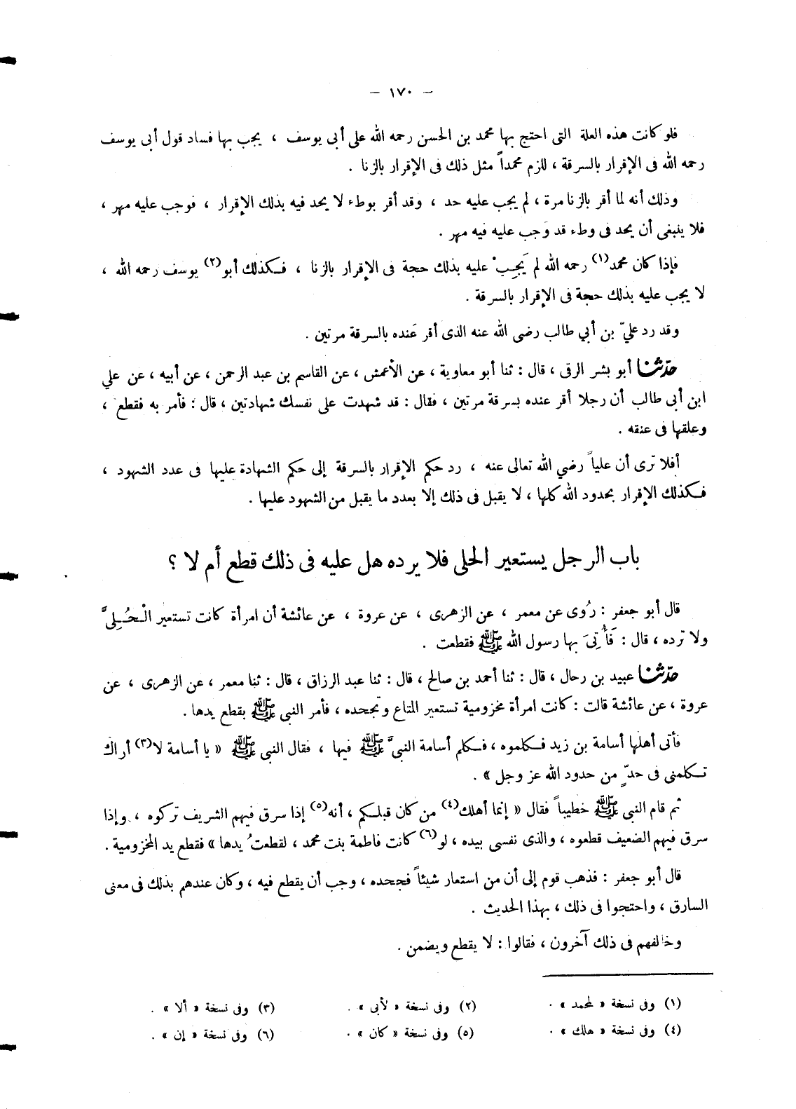 قَالَ أَبُو جَعْفَرٍ: رُوِيَ عَنْ مَعْمَرٍ عَنِ الزُّهْرِيِّ عَنْ عُرْوَةَ عَنْ عَائِشَةَ أَنَّ " §امْرَأَةً كَانَتْ تَسْتَعِيرُ الْحُلِيَّ وَلَا تَرُدُّهُ قَالَ: فَأُتِيَ بِهَا رَسُولُ اللهِ صَلَّى اللَّهُ عَلَيْهِ وَسَلَّمَ فَقُطِعَتْ "