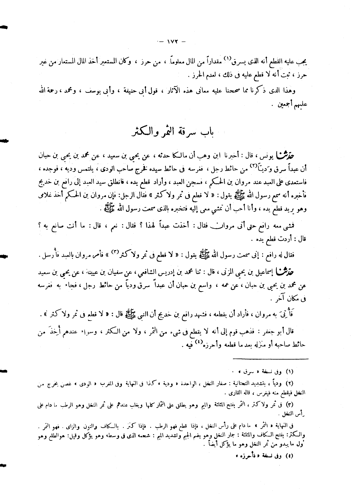 4987 - حَدَّثَنَا يُونُسُ قَالَ: أَخْبَرَنَا ابْنُ وَهْبٍ أَنَّ مَالِكًا حَدَّثَهُ عَنْ يَحْيَى بْنِ سَعِيدٍ عَنْ مُحَمَّدِ بْنِ يَحْيَى بْنِ حِبَّانَ أَنَّ عَبْدًا سَرَقَ وَدِيًّا مِنْ حَائِطِ رَجُلٍ فَغَرَسَهُ فِي حَائِطِ سَيِّدِهِ فَخَرَجَ صَاحِبُ الْوَدِيِّ يَلْتَمِسُ وَدِيَّهُ فَوَجَدَهُ فَاسْتَعْدَى عَلَى الْعَبْدِ عِنْدَ مَرْوَانَ بْنِ الْحَكَمِ فَسَجَنَ الْعَبْدَ وَأَرَادَ قَطْعَ يَدِهِ فَانْطَلَقَ سَيِّدُ الْعَبْدِ إِلَى رَافِعِ بْنِ خَدِيجٍ فَأَخْبَرَهُ أَنَّهُ سَمِعَ رَسُولَ اللهِ صَلَّى اللَّهُ عَلَيْهِ وَسَلَّمَ يَقُولُ: «§لَا قَطْعَ فِي ثَمَرٍ وَلَا كَثَرٍ» فَقَالَ الرَّجُلُ: فَإِنَّ مَرْوَانَ بْنَ الْحَكَمِ أَخَذَ غُلَامِي وَهُوَ يُرِيدُ قَطْعَ يَدِهِ وَأَنَا أُحِبُّ أَنْ تَمْشِيَ مَعِي إِلَيْهِ فَتُخْبِرَهُ بِالَّذِي سَمِعْتَ رَسُولَ اللهِ صَلَّى اللَّهُ عَلَيْهِ وَسَلَّمَ. فَمَشَى مَعَهُ رَافِعٌ حَتَّى أَتَى مَرْوَانَ فَقَالَ: أَخَذْتَ عَبْدًا لِهَذَا؟ فَقَالَ: نَعَمْ , قَالَ: مَا أَنْتَ صَانِعٌ بِهِ؟ قَالَ: أَرَدْتُ قَطْعَ يَدِهِ. فَقَالَ لَهُ رَافِعٌ: إِنِّي سَمِعْتُ رَسُولَ اللهِ صَلَّى اللَّهُ عَلَيْهِ وَسَلَّمَ يَقُولُ: «لَا قَطْعَ فِي ثَمَرٍ وَلَا كَثَرٍ» فَأَمَرَ مَرْوَانُ بِالْعَبْدِ فَأُرْسِلَ.