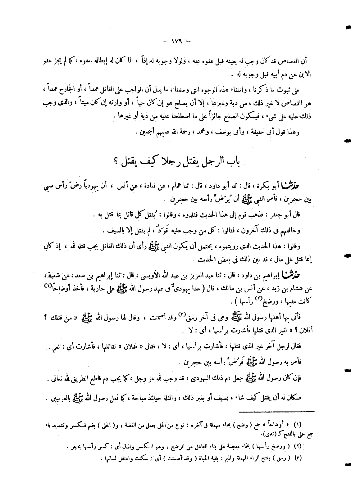 4997 - حَدَّثَنَا أَبُو بَكْرَةَ قَالَ: ثنا أَبُو دَاوُدَ قَالَ: ثنا هَمَّامٌ عَنْ قَتَادَةَ عَنْ أَنَسٍ أَنَّ «§يَهُودِيًّا رَضَّ رَأْسَ صَبِيٍّ بَيْنَ حَجَرَيْنِ فَأَمَرَ النَّبِيُّ صَلَّى اللَّهُ عَلَيْهِ وَسَلَّمَ أَنْ يُرَضَّ رَأْسُهُ بَيْنَ حَجَرَيْنِ» قَالَ أَبُو جَعْفَرٍ: فَذَهَبَ قَوْمٌ إِلَى هَذَا الْحَدِيثِ فَقَلَّدُوهُ وَقَالُوا: يُقْتَلُ كُلُّ قَاتِلٍ بِمَا قُتِلَ بِهِ. وَخَالَفَهُمْ فِي ذَلِكَ آخَرُونَ فَقَالُوا: كُلُّ مَنْ وَجَبَ عَلَيْهِ قَوَدٌ لَمْ يُقْتَلْ إِلَّا بِالسَّيْفِ. وَقَالُوا: هَذَا الْحَدِيثُ الَّذِي رَوَيْتُمُوهُ يَحْتَمِلُ أَنْ يَكُونَ النَّبِيُّ صَلَّى اللَّهُ عَلَيْهِ وَسَلَّمَ رَأَى أَنَّ ذَلِكَ الْقَاتِلَ يَجِبُ قَتْلُهُ لِلَّهِ إِذْ كَانَ إِنَّمَا قَتَلَ عَلَى مَالٍ قَدْ بَيَّنَ ذَلِكَ فِي بَعْضِ الْحَدِيثِ