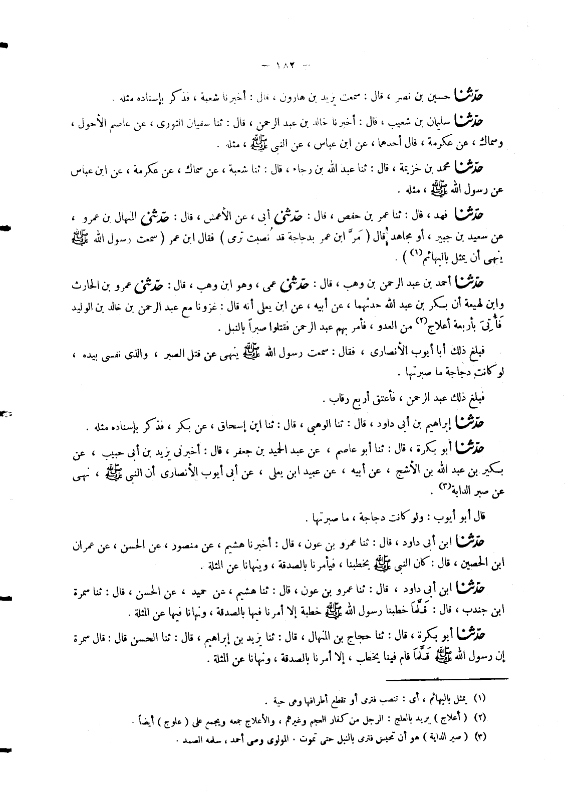 5012 - حَدَّثَنَا فَهْدٌ قَالَ: ثنا عُمَرُ بْنُ حَفْصٍ قَالَ: حَدَّثَنِي أَبِي عَنِ الْأَعْمَشِ قَالَ: حَدَّثَنِي الْمِنْهَالُ بْنُ عَمْرٍو عَنْ سَعِيدِ بْنِ جُبَيْرٍ أَوْ مُجَاهِدٍ قَالَ مَرَّ ابْنُ عُمَرَ بِدَجَاجَةٍ قَدْ نُصِبَتْ تُرْمَى فَقَالَ ابْنُ عُمَرَ سَمِعْتُ رَسُولَ اللهِ صَلَّى اللَّهُ عَلَيْهِ وَسَلَّمَ §يَنْهَى أَنْ يُمَثَّلَ بِالْبَهَائِمِ "