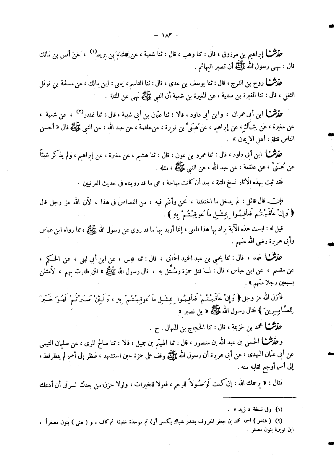 5021 - حَدَّثَنَا ابْنُ أَبِي عِمْرَانَ وَابْنُ أَبِي دَاوُدَ قَالَا: ثنا عُثْمَانُ بْنُ أَبِي شَيْبَةَ قَالَ: ثنا غُنْدَرٌ عَنْ شُعْبَةَ عَنْ مُغِيرَةَ عَنْ شِبَاكٍ عَنْ إِبْرَاهِيمَ عَنْ هُنَيِّ بْنِ نُوَيْرَةَ عَنْ عَلْقَمَةَ عَنْ عَبْدِ اللهِ عَنِ النَّبِيِّ صَلَّى اللَّهُ عَلَيْهِ وَسَلَّمَ قَالَ: §أَحْسَنُ النَّاسِ قِتْلَةً أَهْلُ الْإِيمَانِ "