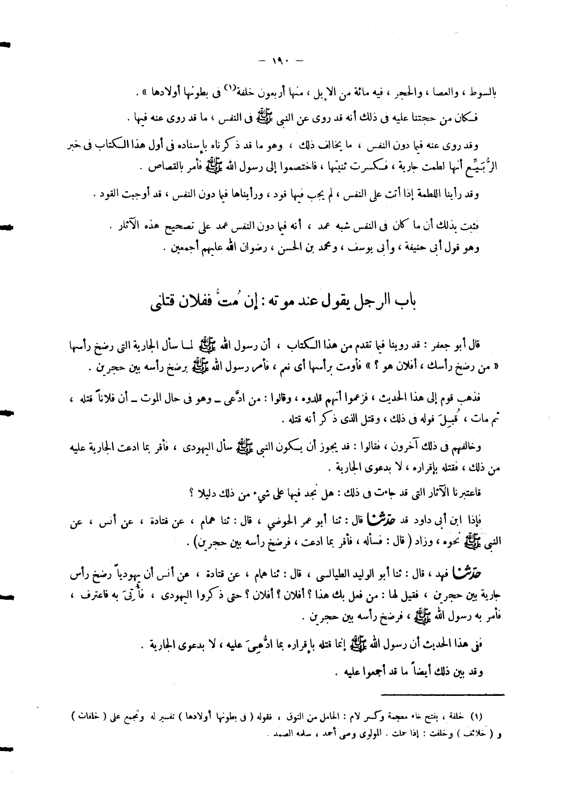 بِالسَّوْطِ وَالْعَصَا وَالْحَجَرِ فِيهِ مِائَةٌ مِنَ الْإِبِلِ مِنْهَا أَرْبَعُونَ خِلْفَةً فِي بُطُونِهَا أَوْلَادُهَا «. فَكَانَ مِنْ حُجَّتِنَا عَلَيْهِ فِي ذَلِكَ أَنَّهُ قَدْ رُوِيَ عَنِ النَّبِيِّ صَلَّى اللَّهُ عَلَيْهِ وَسَلَّمَ فِي النَّفْسِ مَا قَدْ رُوِيَ عَنْهُ فِيهَا. وَقَدْ رُوِيَ عَنْهُ فِيمَا دُونَ النَّفْسِ مَا يُخَالِفُ ذَلِكَ وَهُوَ مَا قَدْ ذَكَرْنَاهُ بِإِسْنَادِهِ فِي أَوَّلِ هَذَا الْكِتَابِ فِي خَبَرِ» الرُّبَيِّعِ أَنَّهَا لَطَمْتُ جَارِيَةً فَكَسَرْتُ ثَنِيَّتَهَا فَاخْتَصَمُوا إِلَى رَسُولِ اللهِ صَلَّى اللَّهُ عَلَيْهِ وَسَلَّمَ فَأَمَرَ بِالْقِصَاصِ ". وَقَدْ رَأَيْنَا اللَّطْمَةَ إِذَا أَتَتْ عَلَى النَّفْسِ لَمْ يَجِبْ فِيهَا قَوَدٌ وَرَأَيْنَاهَا فِيمَا دُونَ النَّفْسِ قَدْ أَوْجَبَتِ الْقَوَدَ. فَثَبَتَ بِذَلِكَ أَنَّ مَا كَانَ فِي النَّفْسِ شِبْهُ عَمْدٍ أَنَّهُ فِيمَا دُونَ النَّفْسِ عَمْدٌ عَلَى تَصْحِيحِ هَذِهِ الْآثَارِ. وَهُوَ قَوْلُ أَبِي حَنِيفَةَ وَأَبِي يُوسُفَ وَمُحَمَّدِ بْنِ الْحَسَنِ رِضْوَانُ اللهِ عَلَيْهِمْ أَجْمَعِينَ
