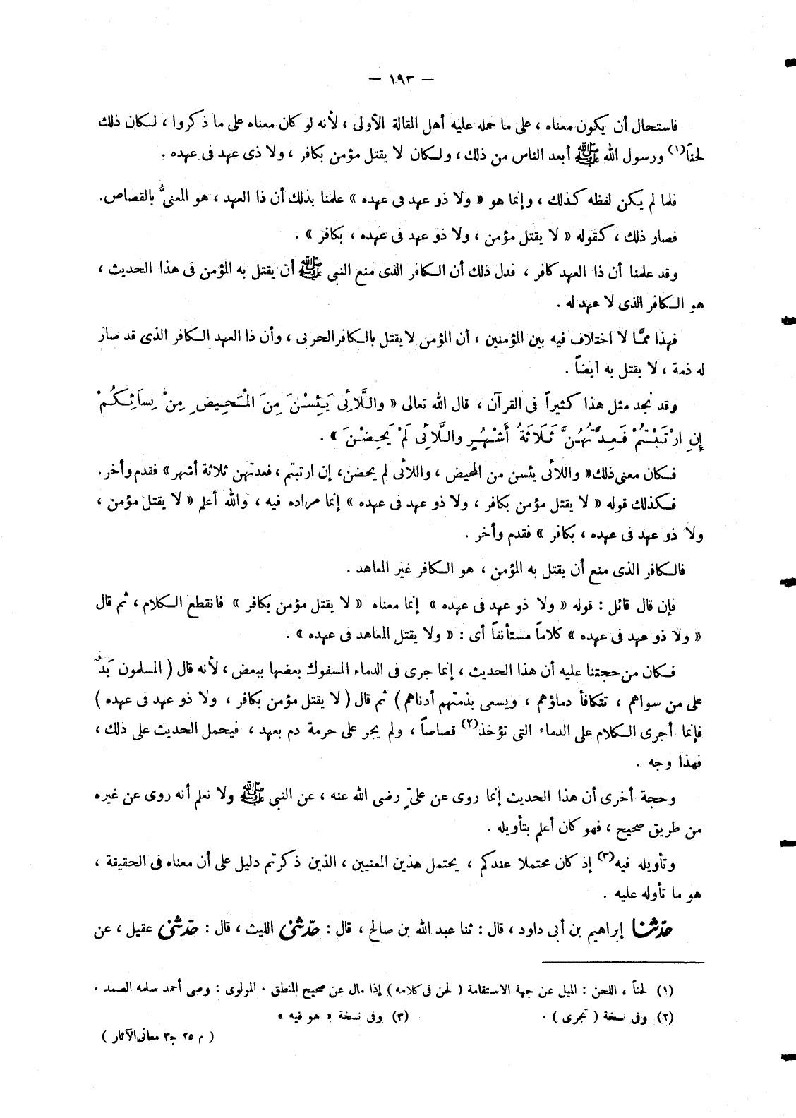 5044 - حَدَّثَنَا إِبْرَاهِيمُ بْنُ أَبِي دَاوُدَ , قَالَ: ثنا عَبْدُ اللهِ بْنُ صَالِحٍ , قَالَ: حَدَّثَنِي اللَّيْثُ , قَالَ: حَدَّثَنِي عُقَيْلٌ , عَنِ -[194]- ابْنِ شِهَابٍ , أَنَّهُ قَالَ: أَخْبَرَنِي سَعِيدُ بْنُ الْمُسَيِّبِ , أَنَّ عَبْدَ الرَّحْمَنِ بْنَ أَبِي بَكْرٍ الصِّدِّيقِ , قَالَ - حِينَ قُتِلَ عُمَرُ - §مَرَرْتُ عَلَى أَبِي لُؤْلُؤَةَ وَمَعَهُ هُرْمُزَانُ. فَلَمَّا بَغَتَهُمْ ثَارُوا فَسَقَطَ مِنْ بَيْنِهِمْ خَنْجَرٌ لَهُ رَأْسَانِ مُمْسَكُهُ فِي وَسَطِهِ. قَالَ: قُلْتُ فَانْظُرُوا لَعَلَّهُ الْخَنْجَرُ الَّذِي قَتَلَ بِهِ عُمَرَ فَنَظَرُوا فَإِذَا هُوَ الْخَنْجَرُ الَّذِي وَصَفَ عَبْدُ الرَّحْمَنِ. فَانْطَلَقَ عُبَيْدُ اللهِ بْنُ عُمَرَ حِينَ سَمِعَ ذَلِكَ مِنْ عَبْدِ الرَّحْمَنِ وَمَعَهُ السَّيْفُ حَتَّى دَعَا الْهُرْمُزَانَ فَلَمَّا خَرَجَ إِلَيْهِ قَالَ: انْطَلِقْ حَتَّى تَنْظُرَ إِلَى فَرَسٍ لِي ثُمَّ تَأَخَّرَ عَنْهُ , إِذَا مَضَى بَيْنَ يَدَيْهِ عَلَاهُ بِالسَّيْفِ , فَلَمَّا وَجَدَ مَسَّ السَّيْفِ قَالَ لَا إِلَهَ إِلَّا اللهُ قَالَ عُبَيْدُ اللهِ وَدَعَوْتُ حُفَيْنَةَ وَكَانَ نَصْرَانِيًّا مِنْ نَصَارَى الْحِيرَةِ فَلَمَّا خَرَجَ إِلَيَّ عَلَوْتُهُ بِالسَّيْفِ فَصَلْتُ بَيْنَ عَيْنَيْهِ , ثُمَّ انْطَلَقَ عُبَيْدُ اللهِ فَقَتَلَ ابْنَةَ أَبِي لُؤْلُؤَةَ صَغِيرَةً تَدَّعِي الْإِسْلَامَ. فَلَمَّا اسْتُخْلِفَ عُثْمَانُ دَعَا الْمُهَاجِرِينَ وَالْأَنْصَارَ فَقَالَ: أَشِيرُوا عَلَيَّ فِي قَتْلِ هَذَا الرَّجُلِ الَّذِي فَتَقَ فِي الدِّينِ مَا فَتَقَ. فَاجْتَمَعَ الْمُهَاجِرُونَ فِيهِ عَلَى كَلِمَةٍ وَاحِدَةٍ يَأْمُرُونَهُ بِالشِّدَّةِ عَلَيْهِ وَيَحُثُّونَ عُثْمَانَ عَلَى قَتْلِهِ وَكَانَ فَوْجُ النَّاسِ الْأَعْظَمِ مَعَ عُبَيْدِ اللهِ يَقُولُونَ لِحُفَيْنَةَ وَالْهُرْمُزَانِ أَبْعَدُهُمَا اللهُ فَكَانَ فِي ذَلِكَ الِاخْتِلَافُ. ثُمَّ قَالَ عَمْرُو بْنُ الْعَاصِ: يَا أَمِيرَ الْمُؤْمِنِينَ إِنَّ هَذَا الْأَمْرَ قَدْ أَعْفَاكَ اللهُ مِنْ أَنْ تَكُونَ بَعْدَمَا قَدْ بُويِعْتَ وَإِنَّمَا كَانَ ذَلِكَ قَبْلَ أَنْ يَكُونَ لَكَ عَلَى النَّاسِ سُلْطَانٌ فَأَعْرَضَ عَنْ عُبَيْدِ اللهِ. وَتَفَرَّقَ النَّاسُ عَنْ خُطْبَةِ عَمْرِو بْنِ الْعَاصِ وَوَدَى الرَّجُلَيْنِ وَالْجَارِيَةَ فَفِي هَذَا الْحَدِيثِ أَنَّ عُبَيْدَ اللهِ رَضِيَ اللهُ عَنْهُ قَتَلَ حُفَيْنَةَ وَهُوَ مُشْرِكٌ وَضَرَبَ الْهُرْمُزَانَ وَهُوَ كَافِرٌ ثُمَّ كَانَ إِسْلَامُهُ بَعْدَ ذَلِكَ. فَأَشَارَ الْمُهَاجِرُونَ رِضْوَانُ اللهِ عَلَيْهِمْ عَلَى عُثْمَانَ رَضِيَ اللهُ عَنْهُ بِقَتْلِ عُبَيْدِ اللهِ , وَعَلِيٌّ فِيهِمْ. فَمُحَالٌ أَنْ يَكُونَ قَوْلُ النَّبِيِّ صَلَّى اللَّهُ عَلَيْهِ وَسَلَّمَ «لَا يُقْتَلُ مُؤْمِنٌ بِكَافِرٍ» يُرَادُ بِهِ غَيْرُ الْحَرْبِيِّ ثُمَّ يُشِيرُ الْمُهَاجِرُونَ وَفِيهِمْ عَلِيٌّ عَلَى عُثْمَانَ بِقَتْلِ عُبَيْدِ اللهِ بِكَافِرٍ ذِي عَهْدٍ وَلَكِنْ مَعْنَاهُ هُوَ عَلَى مَا ذَكَرْنَا مِنْ إِرَادَتِهِ الْكَافِرَ الَّذِي لَا ذِمَّةَ لَهُ. فَإِنْ قَالَ قَائِلٌ: فَفِي هَذَا الْحَدِيثِ أَنَّ عُبَيْدَ اللهِ رَضِيَ اللهُ عَنْهُ قَتَلَ بِنْتًا لِأَبِي لُؤْلُؤَةَ صَغِيرَةً تَدَّعِي الْإِسْلَامَ فَيَجُوزُ أَنْ يَكُونَ إِنَّمَا اسْتَحَلُّوا سَفْكَ دَمِ عُبَيْدِ اللهِ بِهَا لَا بِحُفَيْنَةَ وَالْهُرْمُزَانِ. -[195]- قِيلَ لَهُ: فِي هَذَا الْحَدِيثِ مَا يَدُلُّ عَلَى أَنَّهُ أَرَادَ قَتَلَهُ بِحُفَيْنَةَ وَالْهُرْمُزَانِ وَهُوَ قَوْلُهُمْ «أَبْعَدَهُمَا اللهُ» . فَمُحَالٌ أَنْ يَكُونَ عُثْمَانُ رَضِيَ اللهُ عَنْهُ أَرَادَ أَنْ يَقْتُلَهُ بِغَيْرِهِمَا وَيَقُولُ النَّاسُ لَهُ أَبْعَد