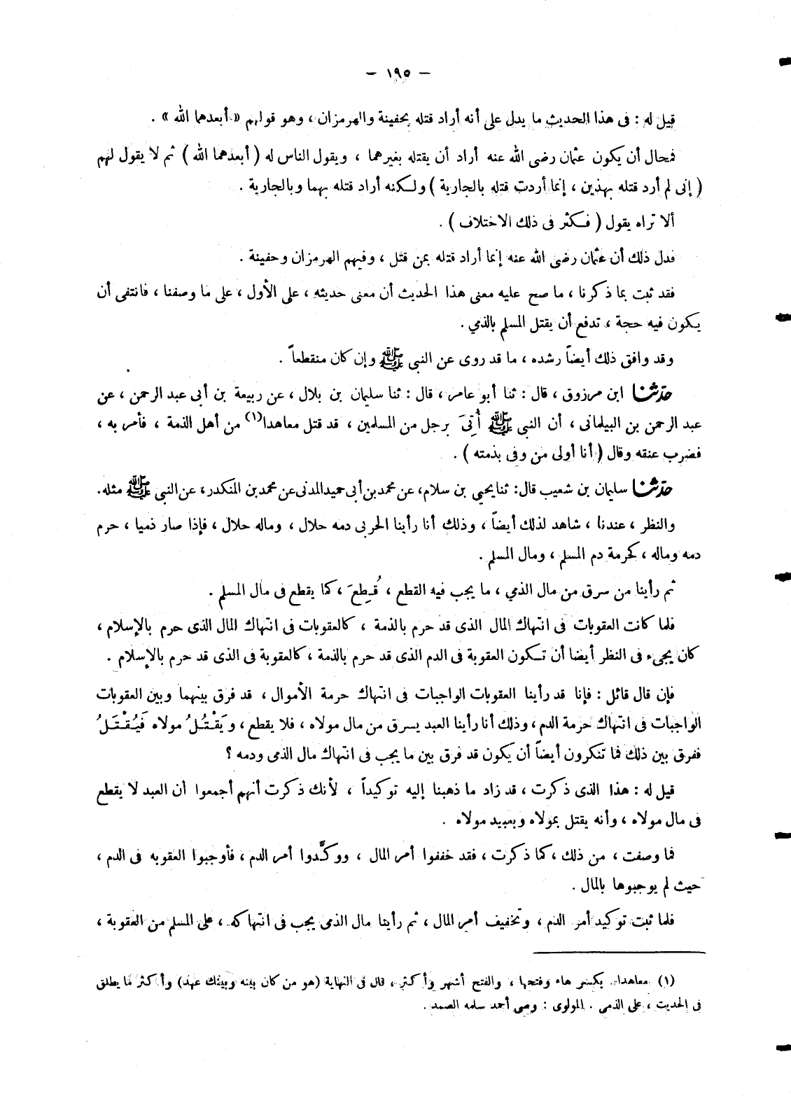 5046 - حَدَّثَنَا سُلَيْمَانُ بْنُ شُعَيْبٍ , قَالَ: ثنا يَحْيَى بْنُ سَلَّامٍ , عَنْ مُحَمَّدِ بْنِ أَبِي حُمَيْدٍ الْمَدَنِيِّ , عَنْ مُحَمَّدِ بْنِ الْمُنْكَدِرِ , عَنِ النَّبِيِّ صَلَّى اللَّهُ عَلَيْهِ وَسَلَّمَ مِثْلَهُ وَالنَّظَرُ عِنْدَنَا شَاهِدٌ لِذَلِكَ أَيْضًا وَذَلِكَ أَنَّا رَأَيْنَا الْحَرْبِيَّ دَمَهُ حَلَالٌ وَمَالَهُ حَلَالٌ , فَإِذَا صَارَ ذِمِّيًّا حَرُمَ دَمُهُ وَمَالُهُ كَحُرْمَةِ دَمِ الْمُسْلِمِ وَمَالِ الْمُسْلِمِ. ثُمَّ رَأَيْنَا مَنْ سَرَقَ مِنْ مَالِ الذِّمِّيِّ مَا يَجِبُ فِيهِ الْقَطْعُ , قُطِعَ كَمَا يُقْطَعُ فِي مَالِ الْمُسْلِمِ. فَلَمَّا كَانَتِ الْعُقُوبَاتُ فِي انْتِهَاكِ الْمَالِ الَّذِي قَدْ حَرُمَ بِالذِّمَّةِ كَالْعُقُوبَاتِ فِي انْتِهَاكِ الْمَالِ الَّذِي حَرُمَ بِالْإِسْلَامِ كَانَ يَجِيءُ فِي النَّظَرِ أَيْضًا أَنْ تَكُونَ الْعُقُوبَةُ فِي الدَّمِ الَّذِي قَدْ حَرُمَ بِالذِّمَّةِ كَالْعُقُوبَةِ فِي الَّذِي قَدْ حَرُمَ بِالْإِسْلَامِ. فَإِنْ قَالَ قَائِلٌ: فَإِنَّا قَدْ رَأَيْنَا الْعُقُوبَاتِ الْوَاجِبَاتِ فِي انْتِهَاكِ حُرْمَةِ الْأَمْوَالِ قَدْ فَرَّقَ بَيْنَهُمَا وَبَيْنَ الْعُقُوبَاتِ الْوَاجِبَاتِ فِي انْتِهَاكِ حُرْمَةِ الدَّمِ , وَذَلِكَ أَنَّا رَأَيْنَا الْعَبْدَ يَسْرِقُ مِنْ مَالِ مَوْلَاهُ فَلَا يُقْطَعُ وَيَقْتُلُ مَوْلَاهُ فَيُقْتَلُ , فَفَرَّقَ بَيْنَ ذَلِكَ فَمَا تُنْكِرُونَ أَيْضًا أَنْ يَكُونَ قَدْ فَرَّقَ بَيْنَ مَا يَجِبُ فِي انْتِهَاكِ مَالِ الذِّمِّيِّ وَدَمِهِ؟ قِيلَ لَهُ: هَذَا الَّذِي ذَكَرْتُ قَدْ زَادَ مَا ذَهَبْنَا إِلَيْهِ تَوْكِيدًا لِأَنَّكَ ذَكَرْتَ أَنَّهُمْ أَجْمَعُوا أَنَّ الْعَبْدَ لَا يُقْطَعُ فِي مَالِ مَوْلَاهُ وَأَنَّهُ يُقْتَلُ بِمَوْلَاهُ وَبِعَبِيدِ مَوْلَاهُ. فَمَا وَصَفْتُ مِنْ ذَلِكَ كَمَا ذَكَرْتُ فَقَدْ خَفَّفُوا أَمْرَ الْمَالِ وَوَكَّدُوا أَمْرَ الدَّمِ فَأَوْجَبُوا الْعُقُوبَةَ فِي الدَّمِ حَيْثُ لَمْ يُوجِبُوهَا بِالْمَالِ. فَلَمَّا ثَبَتَ تَوْكِيدُ أَمْرِ الدَّمِ وَتَخْفِيفُ أَمْرِ الْمَالِ ثُمَّ رَأَيْنَا مَالَ الذِّمِّيِّ يَجِبُ فِي انْتِهَاكِهِ عَلَى الْمُسْلِمِ مِنَ الْعُقُوبَةِ -[196]- كَمَا يَجِبُ عَلَيْهِ فِي انْتِهَاكِ مَالِ الْمُسْلِمِ كَانَ دَمُهُ أَحْرَى أَنْ يَكُونَ عَلَيْهِ فِي انْتِهَاكِ حُرْمَتِهِ مِنَ الْعُقُوبَةِ مَا يَكُونُ عَلَيْهِ فِي انْتِهَاكِ حُرْمَةِ دَمِ الْمُسْلِمِ. وَقَدْ أَجْمَعُوا أَنَّ ذِمِّيًّا لَوْ قَتَلَ ذِمِّيًّا ثُمَّ أَسْلَمَ الْقَاتِلُ أَنَّهُ يُقْتَلُ بِالذِّمِّيِّ الَّذِي قَتَلَهُ فِي حَالِ كُفْرِهِ وَلَا يُبْطِلُ ذَلِكَ إِسْلَامُهُ. فَلَمَّا رَأَيْنَا الْإِسْلَامَ الطَّارِئَ عَلَى الْقَتْلِ لَا يُبْطِلُ الْقَتْلَ الَّذِي كَانَ فِي حَالِ الْكُفْرِ وَكَانَتِ الْحُدُودُ تَمَامُهَا أَحَدُهَا وَلَا يُوجَدُ عَلَى حَالٍ - لَا يَجِبُ فِي الْبَدْءِ مَعَ تِلْكَ الْحَالِ. أَلَا تَرَى أَنَّ رَجُلًا لَوْ قَتَلَ رَجُلًا وَالْمَقْتُولُ مُرْتَدٌّ أَنَّهُ لَا يَجِبُ عَلَيْهِ شَيْءٌ وَأَنَّهُ لَوْ جَرَحَهُ وَهُوَ مُسْلِمٌ ثُمَّ ارْتَدَّ - عِيَاذًا بِاللهِ - فَمَاتَ لَمْ يُقْتَلْ. فَصَارَتْ رِدَّتُهُ الَّتِي تَقَدَّمَتِ الْجِنَايَةَ وَالَّتِي طَرَأَتْ عَلَيْهَا فِي دَرْءِ الْقَتْلِ - سَوَاءً. فَكَانَ كَذَلِكَ فِي النَّظَرِ أَنْ يَكُونَ الْقَاتِلُ قَبْلَ جِنَايَتِهِ وَبَعْدَ جِنَايَتِهِ سَوَاءً. وَلَمَّا كَانَ إِسْلَامُهُ بَعْدَ جِنَايَتِهِ قَبْلَ أَنْ يُقْتَلَ بِهَا لَا يَدْفَعُ عَنْهُ الْقَوَدَ كَانَ كَذَلِكَ إِسْلَامُهُ الْمُتَقَدِّمُ لِجِنَايَتِهِ لَا يَدْفَعُ عَنْهُ الْقَوَدَ. وَهَذَا قَوْلُ أَبِي حَنِيفَةَ وَأَبِي يُوسُفَ وَمُحَمَّدٍ رَحْم
