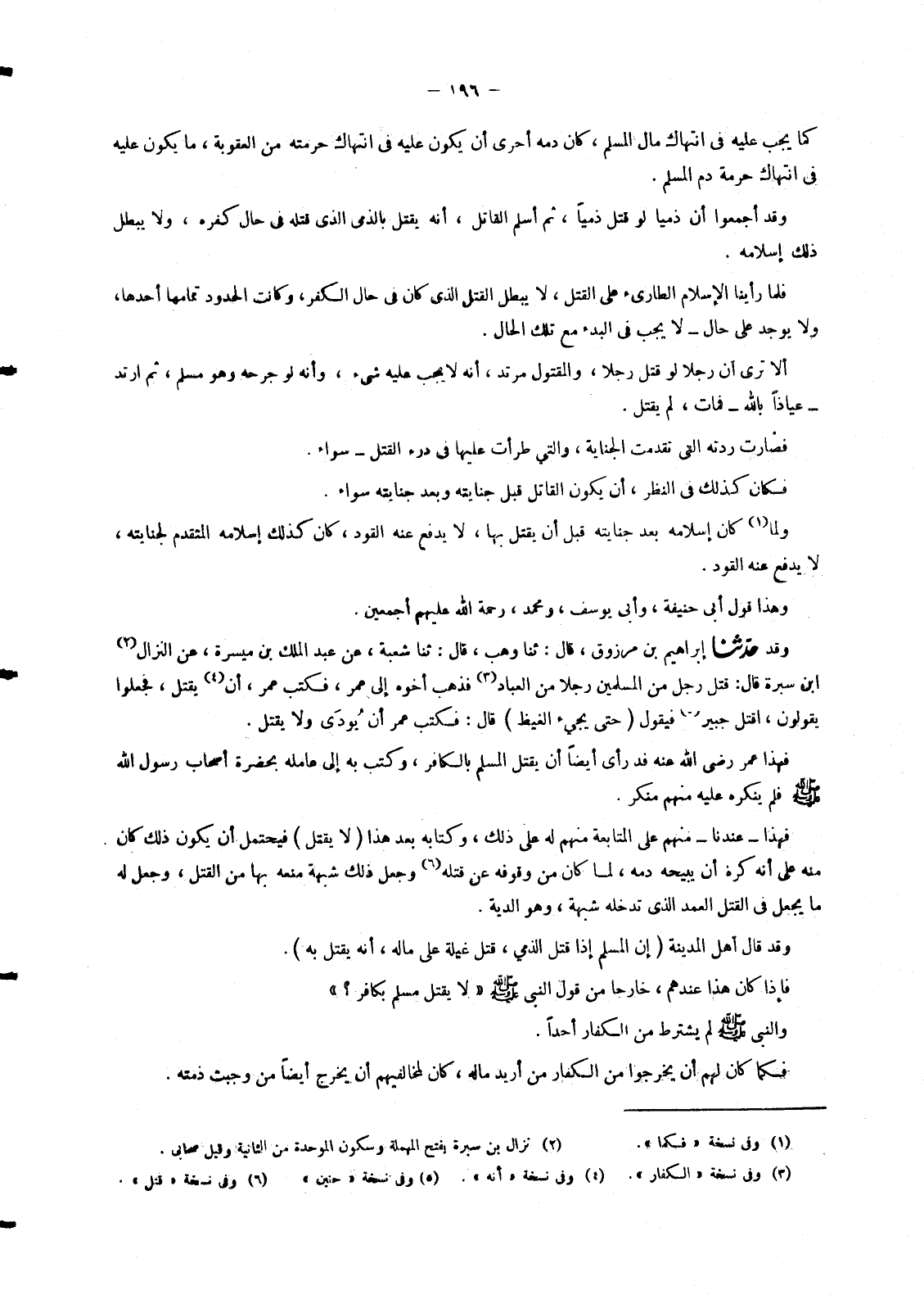 5047 - حَدَّثَنَا إِبْرَاهِيمُ بْنُ مَرْزُوقٍ قَالَ: ثنا وَهْبٌ قَالَ: ثنا شُعْبَةُ عَنْ عَبْدِ الْمَلِكِ بْنِ مَيْسَرَةَ عَنِ النَّزَّالِ بْنِ سَبْرَةَ قَالَ: §قَتَلَ رَجُلٌ مِنَ الْمُسْلِمِينَ رَجُلًا مِنَ الْعِبَادِ فَذَهَبَ أَخُوهُ إِلَى عُمَرَ فَكَتَبَ عُمَرُ أَنْ يُقْتَلَ فَجَعَلُوا يَقُولُونَ: اقْتُلْ جُبَيْرُ فَيَقُولُ حَتَّى يَجِيءَ الْغَيْظُ قَالَ: فَكَتَبَ عُمَرُ أَنْ يُودِي وَلَا يُقْتَلَ فَهَذَا عُمَرُ رَضِيَ اللهُ عَنْهُ قَدْ رَأَى أَيْضًا أَنْ يُقْتَلَ الْمُسْلِمُ بِالْكَافِرِ، وَكَتَبَ بِهِ إِلَى عَامِلِهِ بِحَضْرَةِ أَصْحَابِ رَسُولِ اللهِ صَلَّى اللَّهُ عَلَيْهِ وَسَلَّمَ فَلَمْ يُنْكِرْهُ عَلَيْهِ مِنْهُمْ مُنْكِرٌ. فَهَذَا - عِنْدَنَا - مِنْهُمْ عَلَى الْمُتَابَعَةِ مِنْهُمْ لَهُ عَلَى ذَلِكَ وَكِتَابُهُ بَعْدَ هَذَا لَا يُقْتَلُ فَيَحْتَمِلُ أَنْ يَكُونَ ذَلِكَ كَانَ مِنْهُ عَلَى أَنَّهُ كَرِهَ أَنْ يُبِيحَهُ دَمَهُ لَمَا كَانَ مِنْ وُقُوفِهِ عَنْ قَتْلِهِ وَجَعَلَ ذَلِكَ شُبْهَةَ مَنْعِهِ بِهَا مِنَ الْقَتْلِ وَجَعَلَ لَهُ مَا يُجْعَلُ فِي الْقَتْلِ الْعَمْدِ الَّذِي تَدْخُلُهُ شُبْهَةٌ وَهُوَ الدِّيَةُ. وَقَدْ قَالَ أَهْلُ الْمَدِينَةِ إِنَّ الْمُسْلِمَ إِذَا قَتَلَ الذِّمِّيَّ قَتْلَ غِيلَةٍ عَلَى مَالِهِ أَنَّهُ يُقْتَلُ بِهِ. فَإِذَا كَانَ هَذَا عِنْدَهُمْ خَارِجًا مِنْ قَوْلِ النَّبِيِّ صَلَّى اللَّهُ عَلَيْهِ وَسَلَّمَ «لَا يُقْتَلُ مُسْلِمٌ بِكَافِرٍ؟» وَالنَّبِيُّ صَلَّى اللَّهُ عَلَيْهِ وَسَلَّمَ لَمْ يَشْتَرِطْ مِنَ الْكُفَّارِ أَحَدًا. فَكَمَا كَانَ لَهُمْ أَنْ يُخْرِجُوا مِنَ الْكُفَّارِ مَنْ أُرِيدَ مَالُهُ كَانَ لِمُخَالِفِيهِمْ أَنْ يَخْرُجَ أَيْضًا مَنْ وَجَبَتْ ذِمَّتُهُ