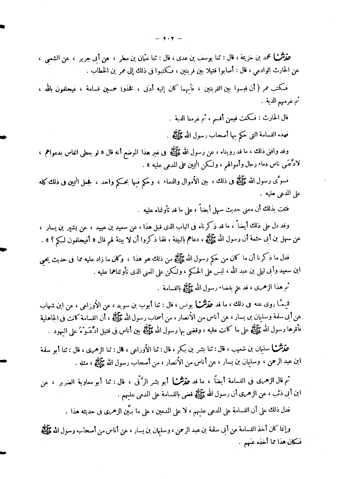 عَنْ سَعِيدِ بْنِ عُبَيْدٍ عَنْ بُشَيْرِ بْنِ يَسَارٍ عَنْ سَهْلِ بْنِ أَبِي حَثْمَةَ أَنَّ رَسُولَ اللهِ صَلَّى اللَّهُ عَلَيْهِ وَسَلَّمَ §دَعَاهُمْ بِالْبَيِّنَةِ فَلَمَّا ذَكَرُوا أَنْ لَا بَيِّنَةَ لَهُمْ قَالَ «أَفَيَحْلِفُونَ لَكُمْ؟» فَدَلَّ مَا ذَكَرْنَا أَنَّ مَا كَانَ مِنْ حُكْمِ رَسُولِ اللهِ صَلَّى اللَّهُ عَلَيْهِ وَسَلَّمَ مِنْ ذَلِكَ هُوَ هَذَا وَكَانَ مَا زَادَ عَلَيْهِ مِمَّا فِي حَدِيثِ يَحْيَى بْنِ سَعِيدٍ وَأَبِي لَيْلَى بْنِ عَبْدِ اللهِ لَيْسَ عَلَى الْحُكْمِ وَلَكِنْ عَلَى الْمَعْنَى الَّذِي تَأَوَّلْنَاهُمَا عَلَيْهِ. ثُمَّ هَذَا الزُّهْرِيُّ قَدْ عَلِمَ بِقَضَاءِ رَسُولِ اللهِ صَلَّى اللَّهُ عَلَيْهِ وَسَلَّمَ بِالْقَسَامَةِ. فَمِمَّا رُوِيَ عَنْهُ فِي ذَلِكَ مَا قَدْ